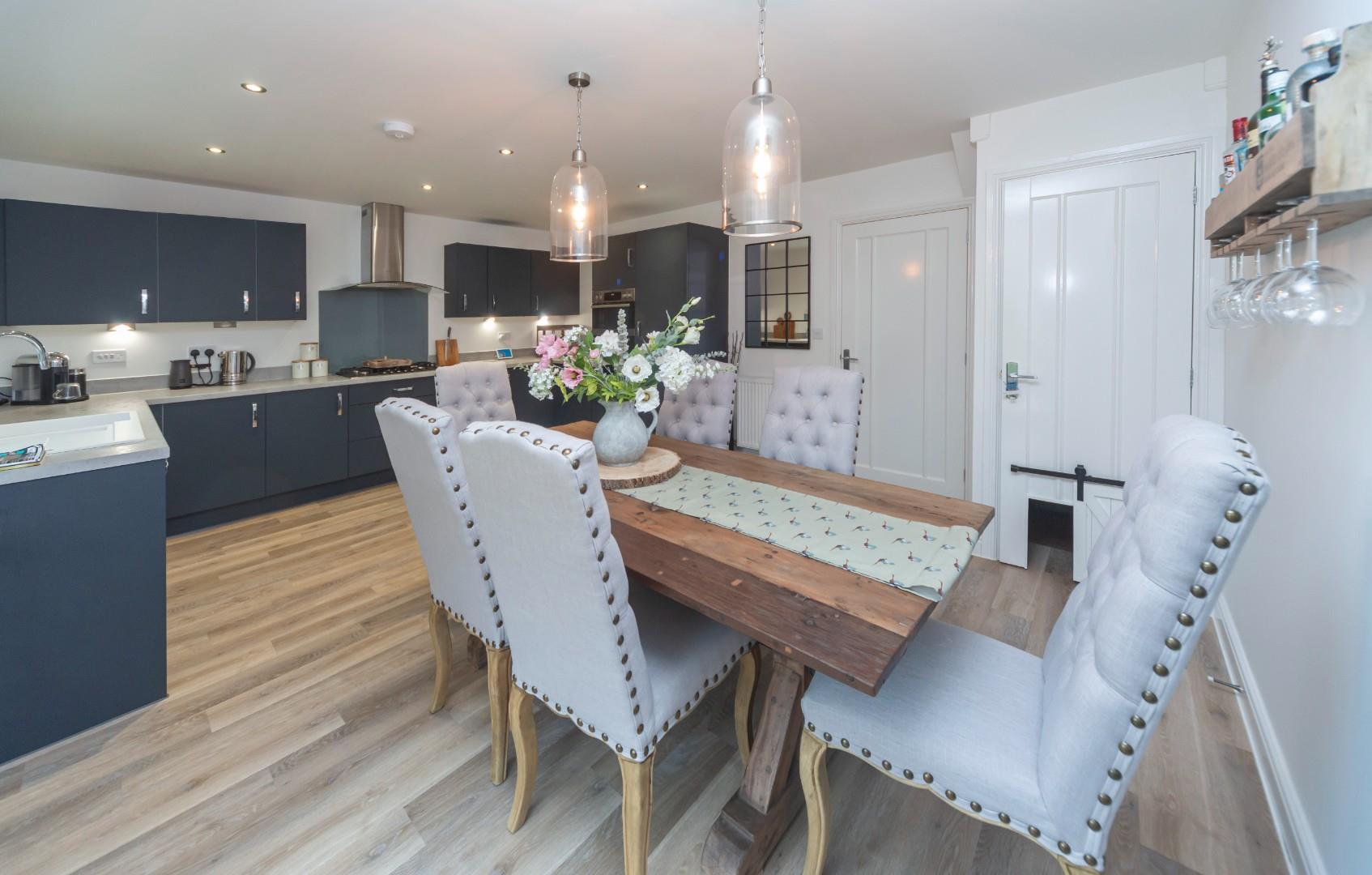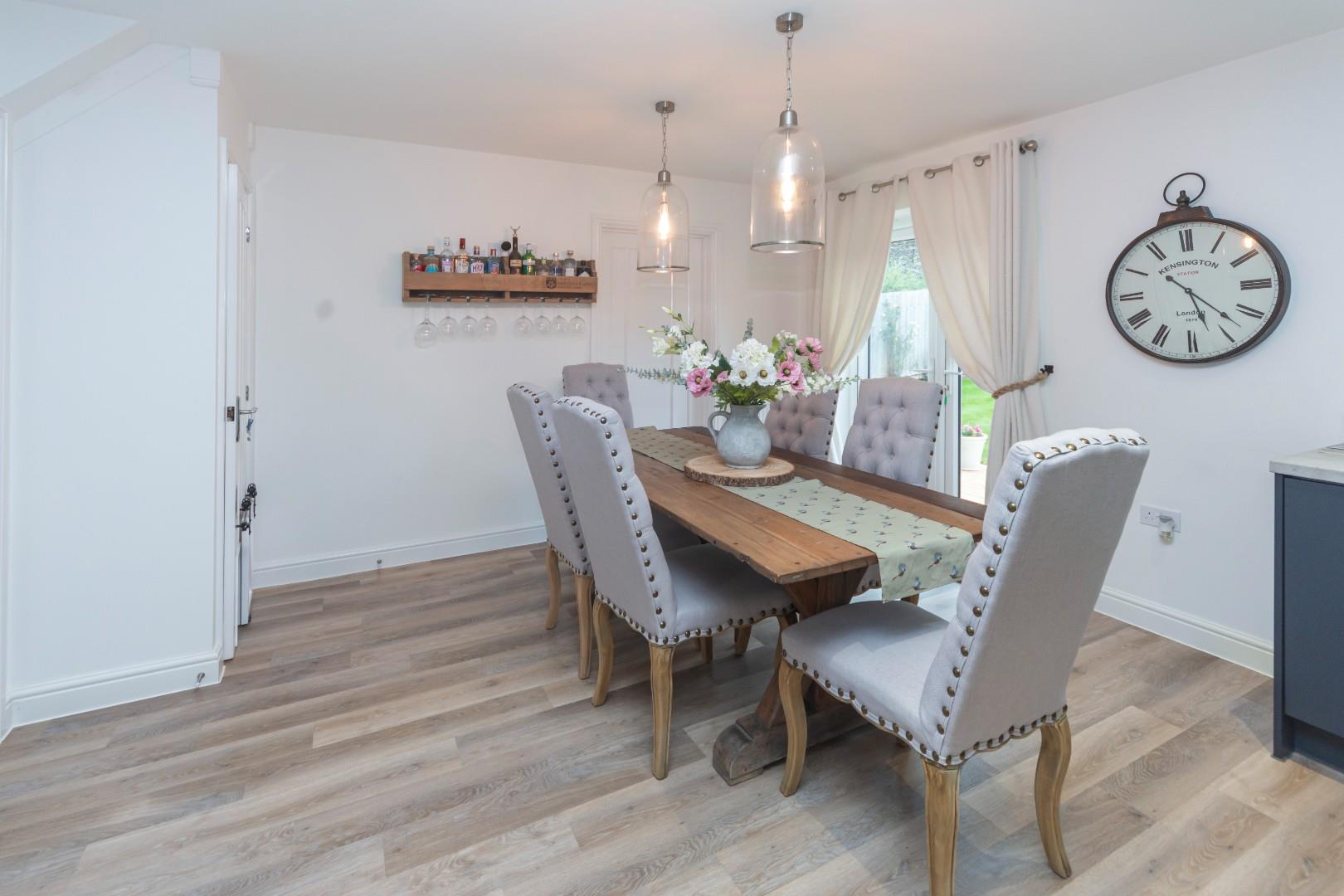 Upon entering, you are greeted by a welcoming entrance hall with feature panelling, setting a tone of elegance throughout the home. The spacious lounge, also featuring wall panelling, offers a comfortable space to relax with views out to the front aspect. At the heart of the home lies an attractive dining kitchen, which is perfect for family meals and entertaining. French doors open into the garden, creating a seamless flow between indoor and outdoor spaces. The kitchen conveniently connects to a utility room and a guest cloakroom, enhancing practicality.