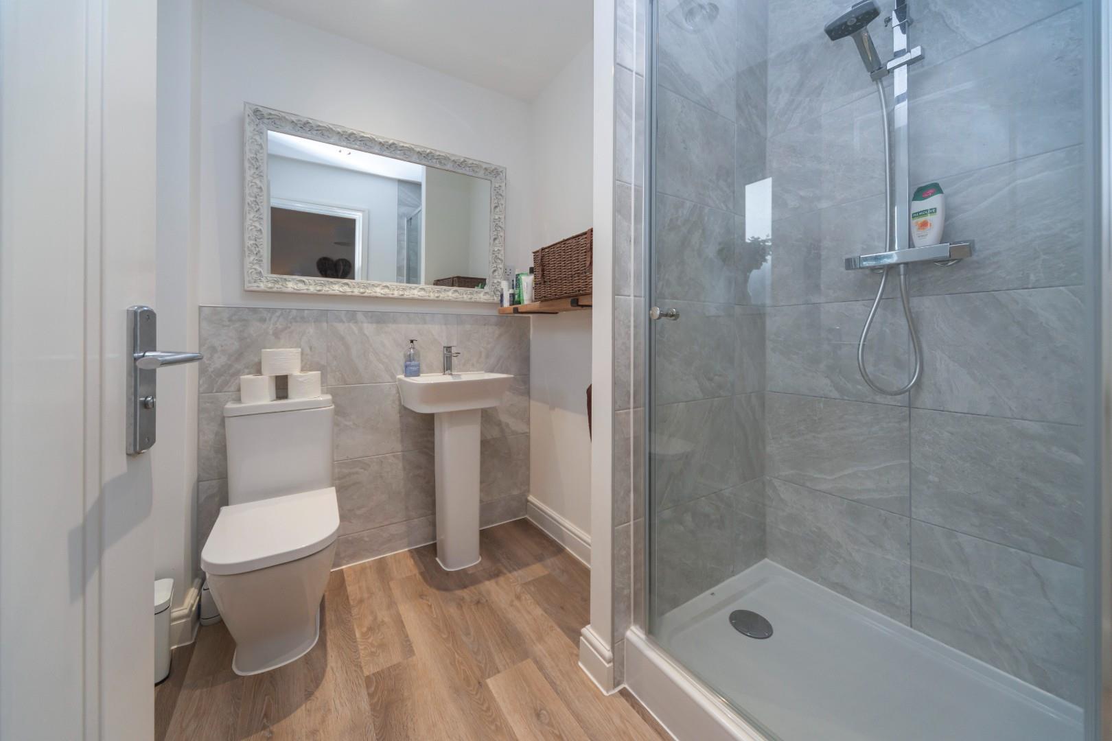 Is equipped with a pedestal hand wash basin, W.C., fully tiled shower enclosure with rain shower and hand held heads, there are attractive tiled surrounds, recessed ceiling down lights, heated chrome towel rail and an obscure window to the front aspect.