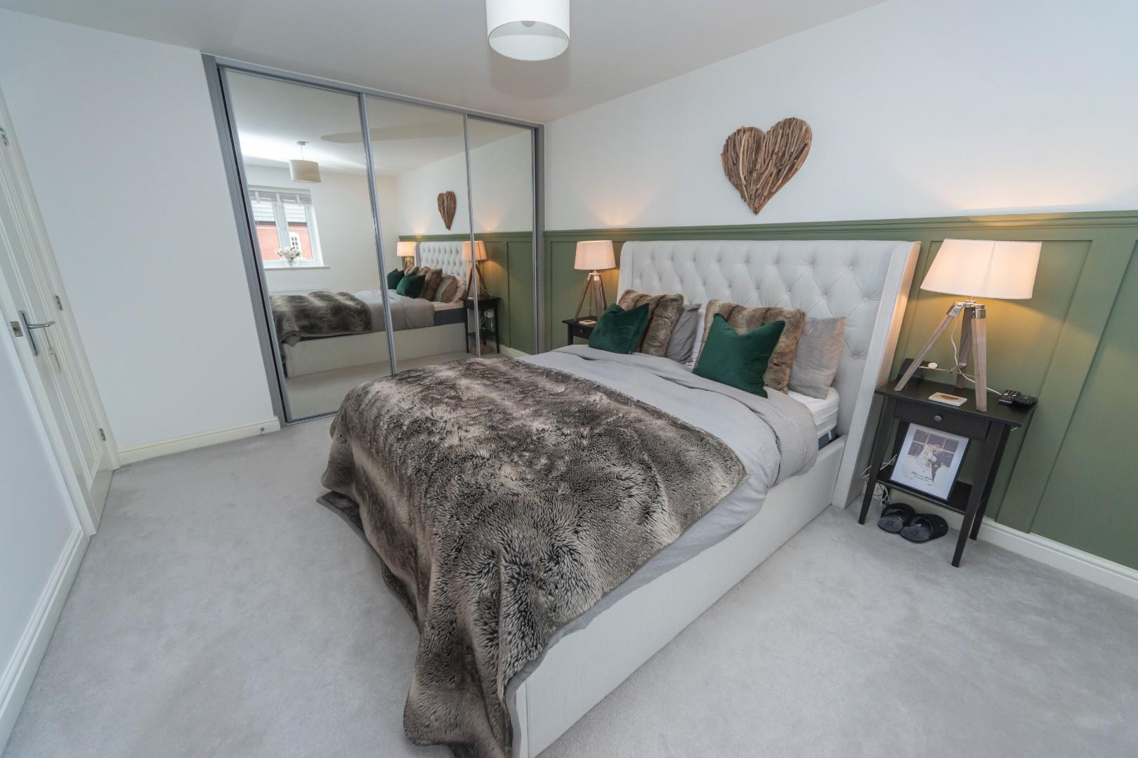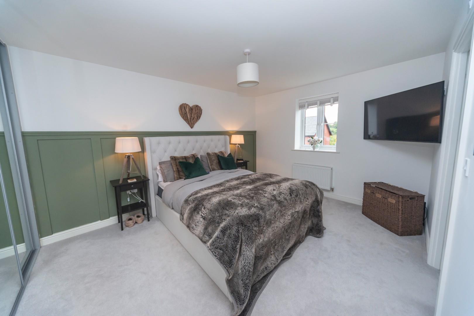 This attractive room has feature wood panelling wall, built in wardrobes with mirror sliding doors, window to the front aspect, radiator, ceiling light point and door leading through to the en suite shower room.