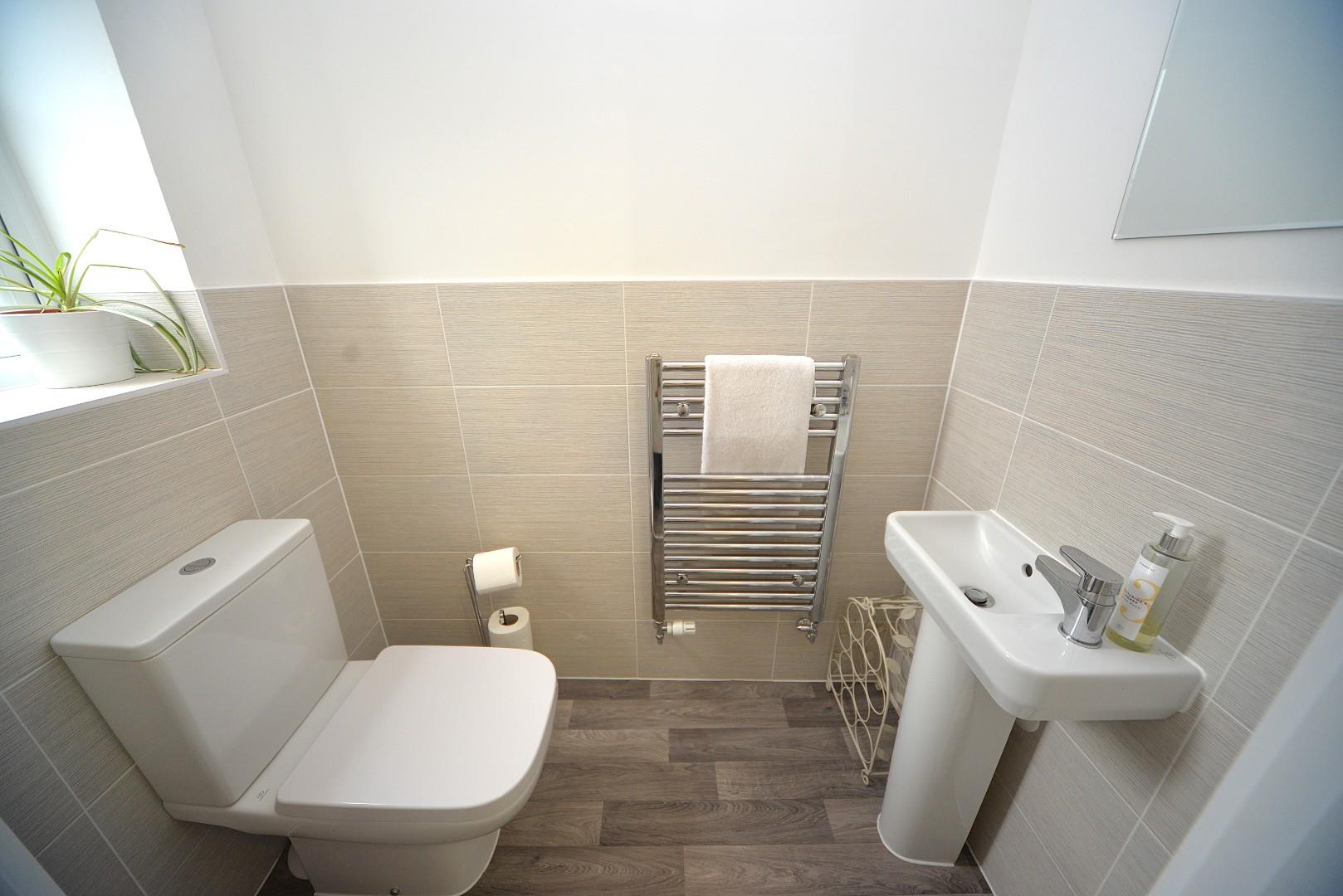 Has a pedestal hand wash basin, W.C., chrome heated towel rail, there is an obscure window to the front aspect and tiled surrounds.