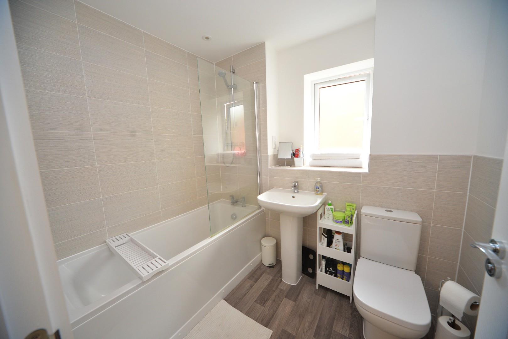 Is equipped with a bath with mixer taps and separate electric shower over with glazed screen, pedastal hand wash basin, W.C., there is a large heated chrome towel rail, window to the side aspect, recessed ceiling down lights, tiled surrounds and wood effect flooring.
