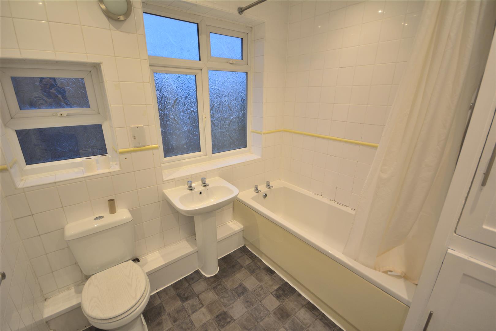 Low level w.c., pedestal wash hand basin, panel bath with full tiled surrounds, built in airing cupboard and radiator.