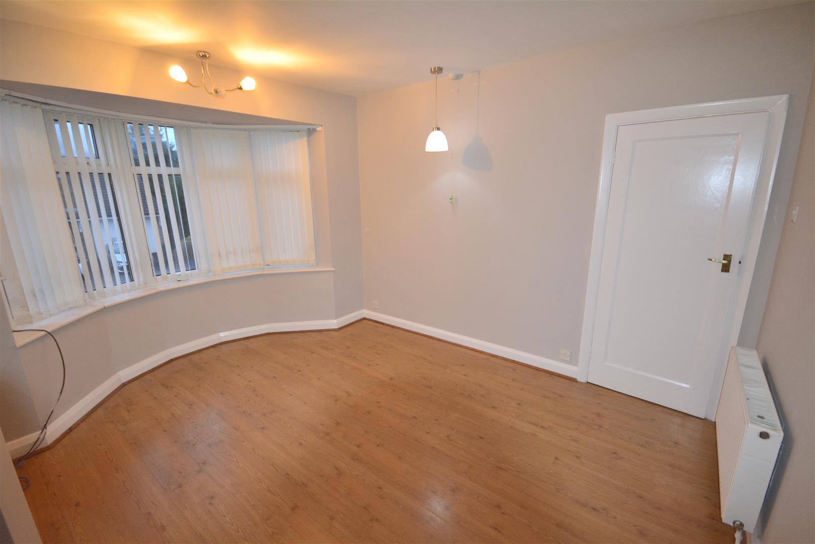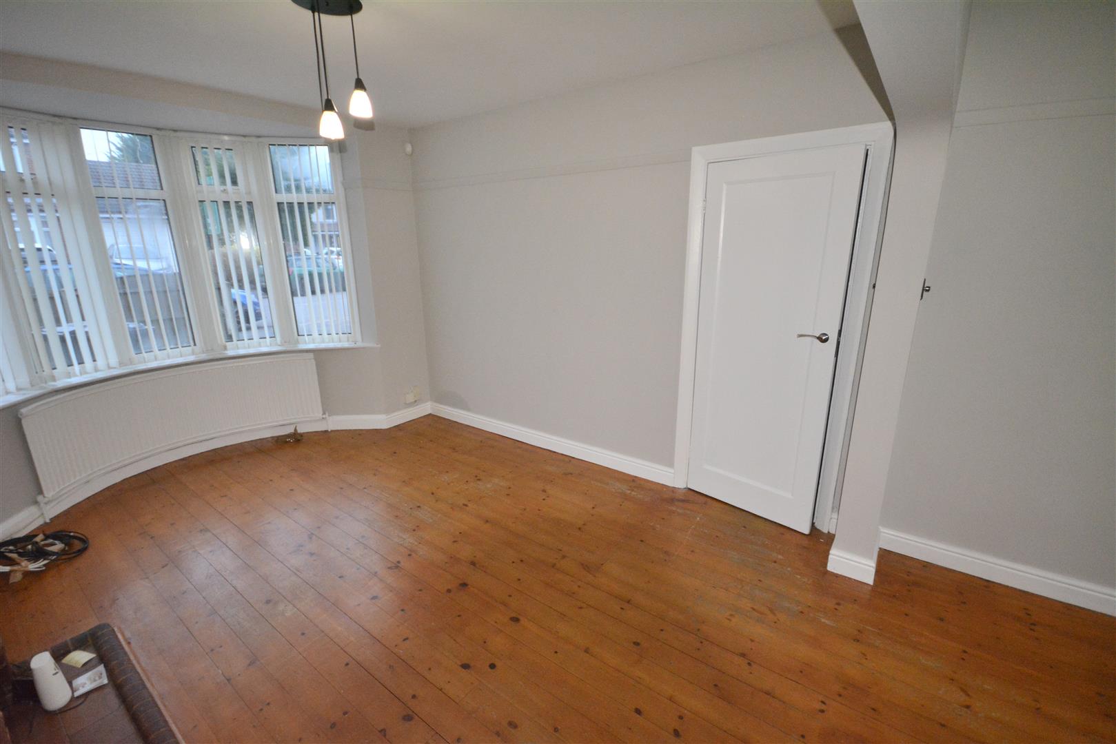 Brick feature fireplace hearth and mantel, picture rail, radiator and bay window to the front.