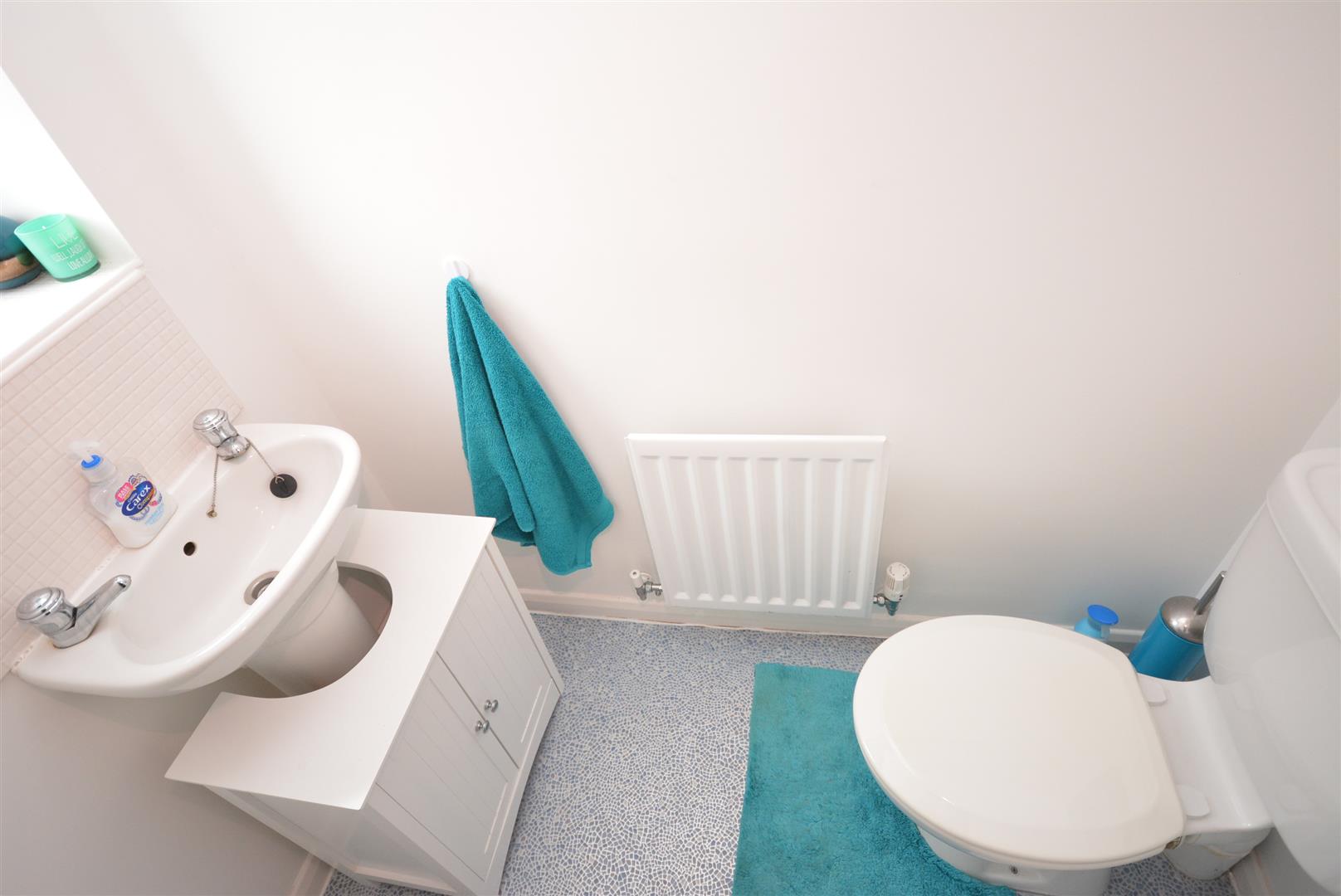 With low flush w.c., pedestal wash hand basin, vinyl flooring, central heating radiator and obscure UPVC double glazed window to the front elevation.