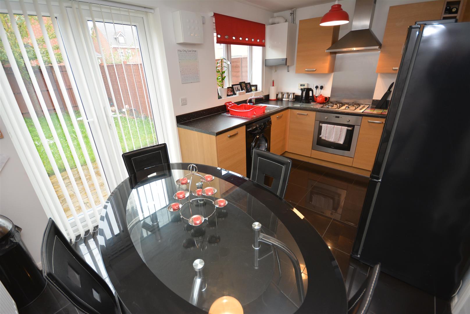 With polished ceramic tiled flooring, range of fitted base, wall and drawer units having matching oak effect cupboard and drawer fronts, roll edge granite effect laminated work surfaces with matching upstands and inset stainless steel sink unit and draining board, modern mixer tap in chrome, integrated electric fan assisted oven and built-in four ring gas hob with stainless steel backplate and extractor hood having variable speed fan and lighting over. Wall mounted gas boiler servicing the central heating system, plumbing suitable for an automatic washing machine and UPVC double glazed window to the rear. Ample dining space with useful understairs storage cupboard, double radiator and UPVC double glazed double doors provide access to the rear garden.