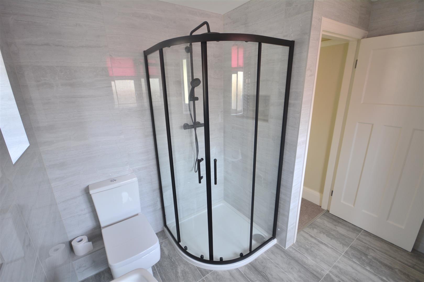 Newly fitted bathroom suit with pedestal wash hand basin, panelled bath, shower cubicle with mains fed shower unit . Tiled surrounds.