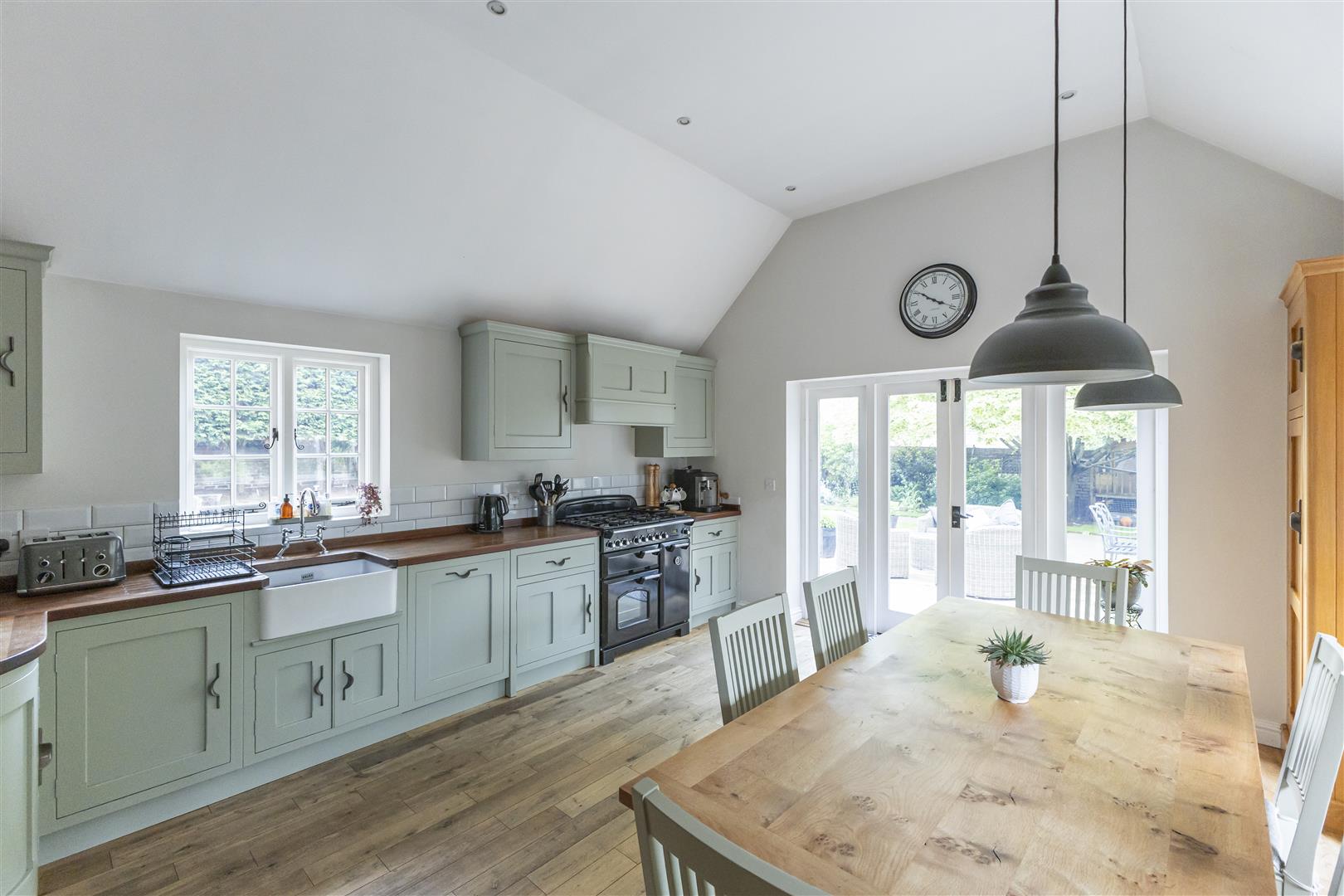 Upon entering the barn you are welcomed into an entrance hall that features a useful boot cupboard, stairs leading to the first floor, and doors opening to the kitchen study/reading area. The study/reading room is a lovely space for quiet relaxation or study and opens into the charming sitting room. The sitting room boasts lovely neutral décor, bespoke shelving within the chimney breast, and an electric log-style burner resting on a raised brick hearth. The impressive kitchen and dining area provide a fantastic space for entertaining. This room features a high ceiling with light flooding in through the windows a n d bi-fold doors that offer views of three sides of the garden. The bespoke kitchen is built with oak and includes natural and painted oak units complemented by attractive walnut countertops that house a Belfast sink. It is equipped with a range cooker, a built-in dishwasher, a double fridge, and a double freezer. This space offers ample room for a dining table and chairs, along with a useful cupboard with space for both washing machine and a tumble dryer. A door from the kitchen leads to the annex area, where you will find two bedrooms along with a ground-floor shower room. The final door opens into a superb open-plan kitchen, living, and dining area with its own entrance door, showcasing a stunning exposed stone wall and fitted with modern kitchen units and appliances. On the first floor, you will discover the principal bedroom, which features windows on both the front and rear aspects built-in his and hers wardrobes, and an attractive ensuite bathroom that includes a bath, wash basin, and W.C. Additionally, there is a bespoke oak wall-mounted vanity unit and walls are adorned with period-style
