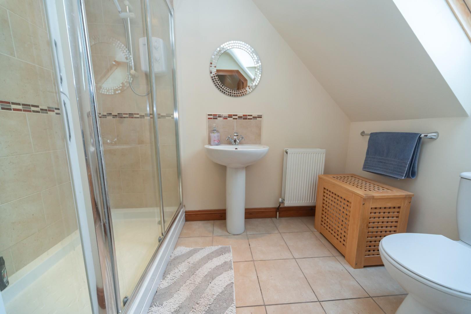 Has recessed ceiling down lights, Velux window to the side aspect, tiled flooring and is fitted with a W.C., pedestal hand wash basin with tiled splashbacks and a fully tiled shower enclosure with glazed screen and Triton electric shower.