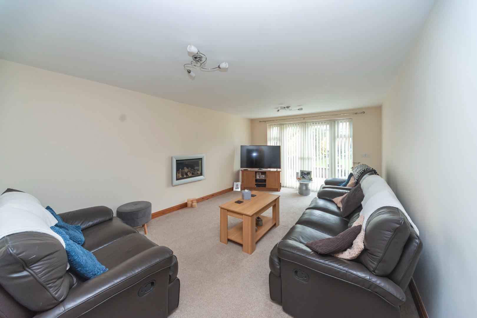 Has patio doors with glazed side screens opening up onto the rear patio with views over the garden, there is a living flame effect gas fire inset and ceiling light points.