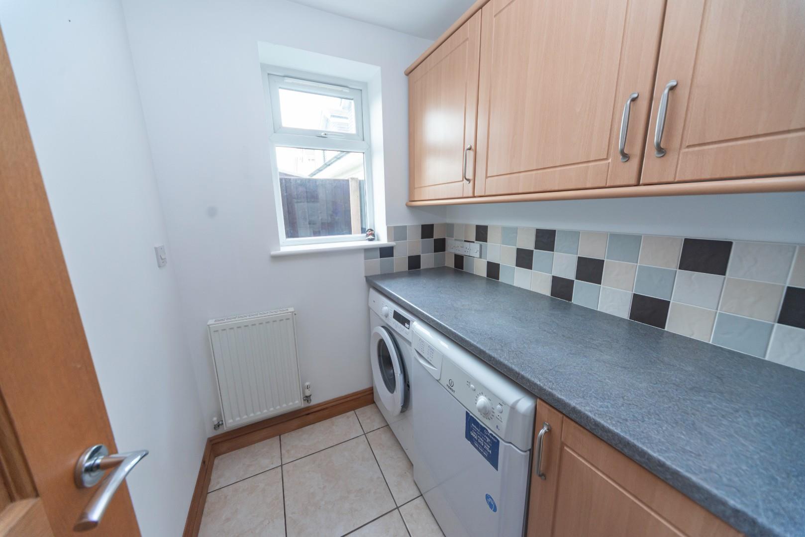 Has a window to the side aspect, base cupboards with work top over and a matching range of wall mounted cabinets, there is provision for a washing machine, space for tumble dryer, tiled splashbacks and ceiling light point.