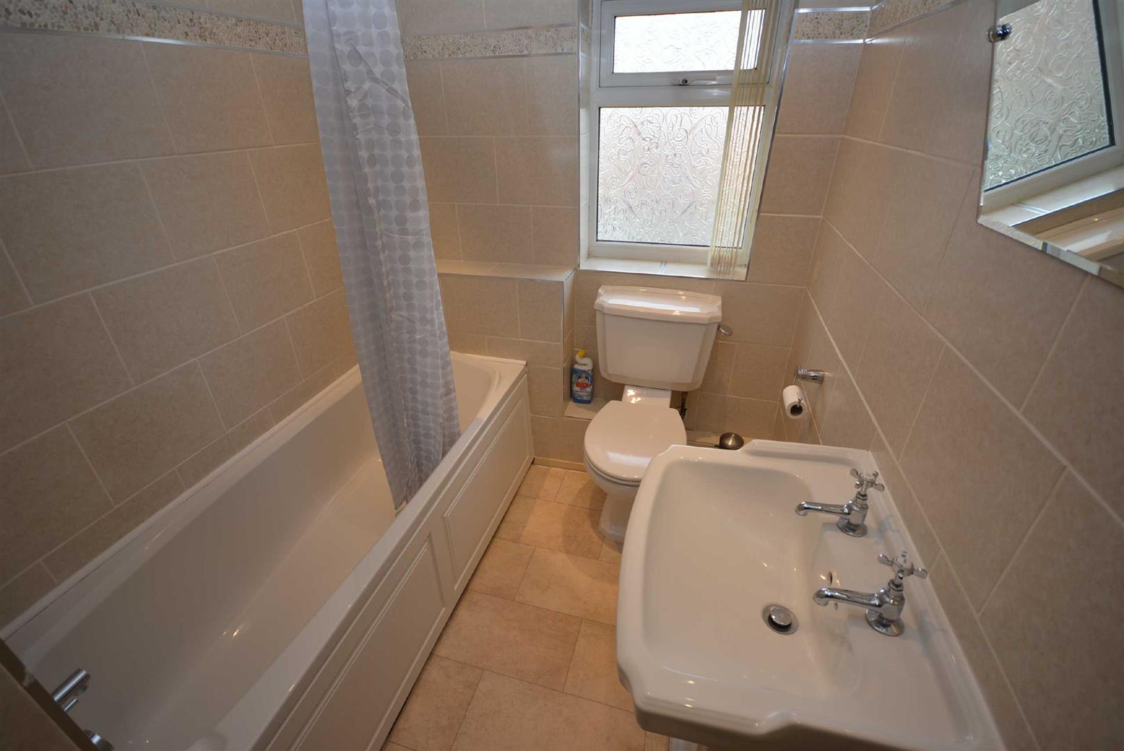 With full suite in white comprising low flush WC, pedestal wash hand basin and panelled bath with electric shower over. Floor to ceiling ceramic wall tiling, stone effect flooring, airing cupboard housing hot water cylinder, centrally heated ladder style towel rail and obscure upvc double glazed window to the front.