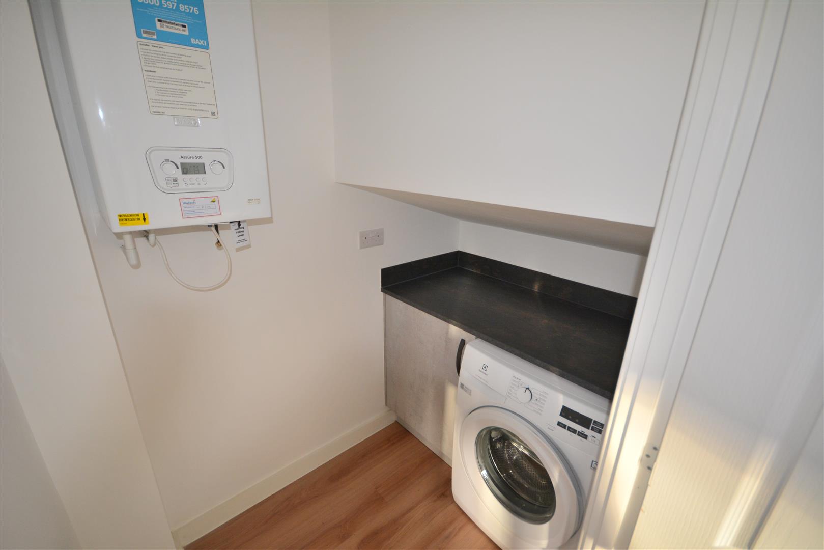 Utility room with cupboard space and worktop over, washing machine and boiler.
