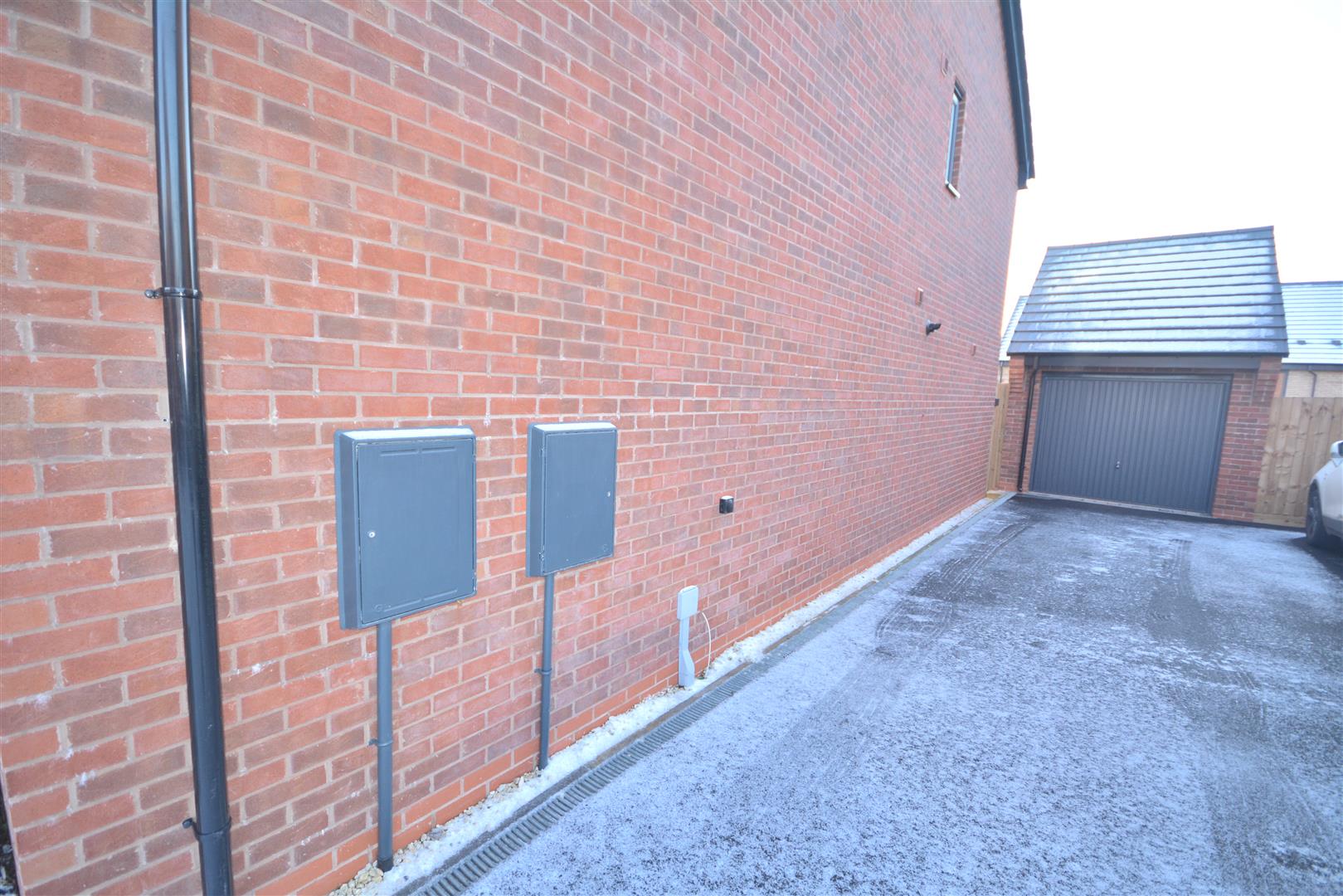 Spacious rear garden with Lawn and patio area. Parking to the side of the property with space for two cars. Large garage to the side of the property.