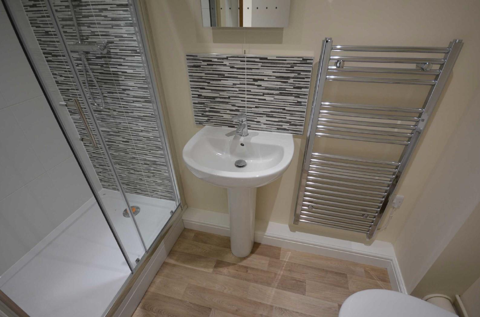 Comprising sizeable shower cubicle with mains thermostatic mixer shower and sliding shower door, pedestal wash hand basin and low flush WC, complementary contemporary ceramic wall tiling, electric heated ladder style towel rail, oak effect flooring, recess spotlighting and extractor fan.