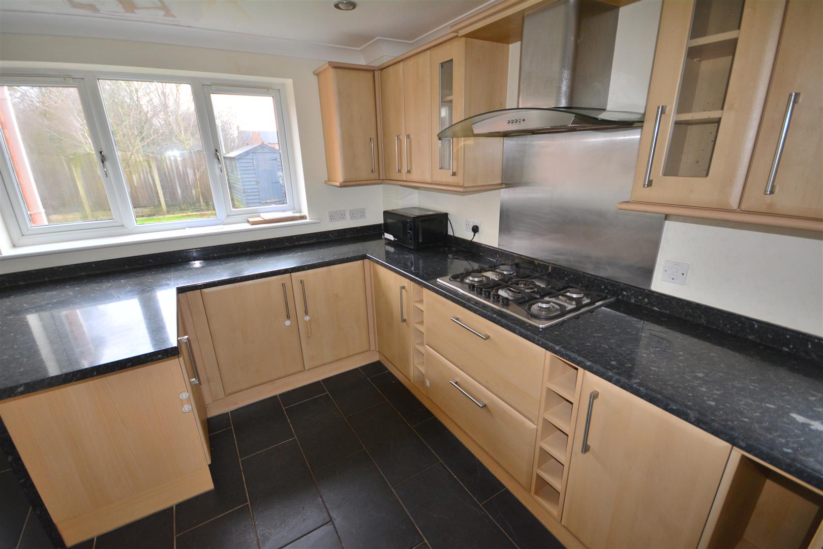 Modern fitted kitchen comprising wood finish fronted wall and base units with work surfaces over, built-in stainless-steel sink with drainer. In built electric cooker with four ring gas hob with stainless steel extractor over. UPVC double glazed windows. Integrated Dishwasher and fridge freezer.