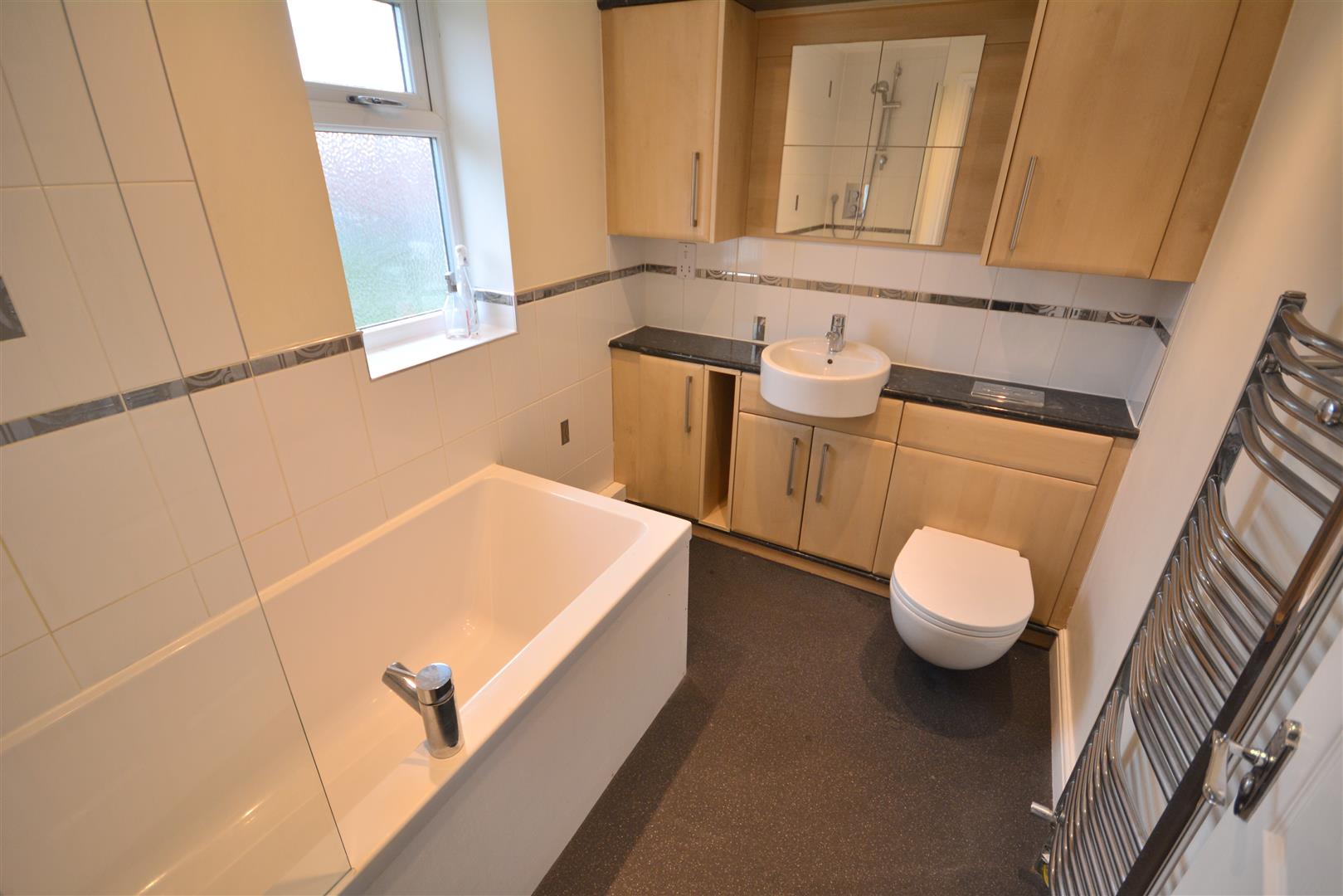 Fitted with a three piece white suite comprising panelled bath with shower over, pedestal wash hand basin and low flush W/C.