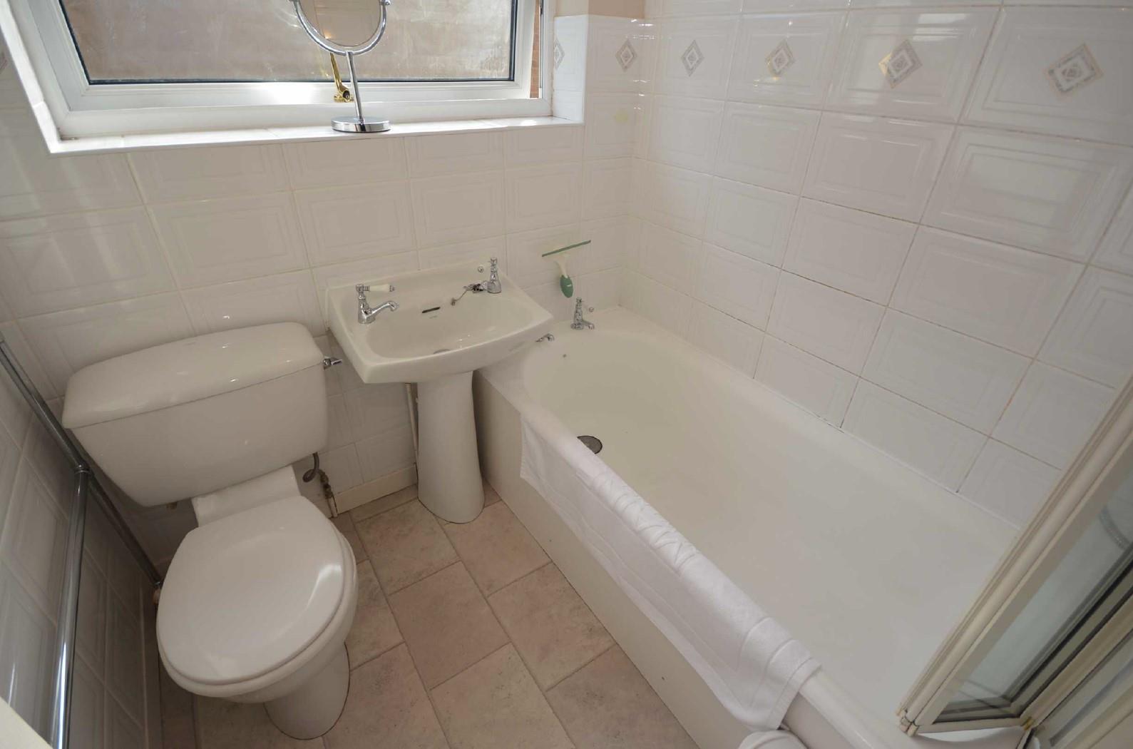 Fitted with a full modern suite in white comprising low flush w.c., pedestal wash hand basin and panelled bath with thermostatic mixer shower over and a fitted bi-fold shower screen. Ceramic wall tiling and effec vinyl flooring. Centrally heated chrome towel radiator. Useful built-in storage cupboard with louvred door. Obscure uPVC double glazed window to side.