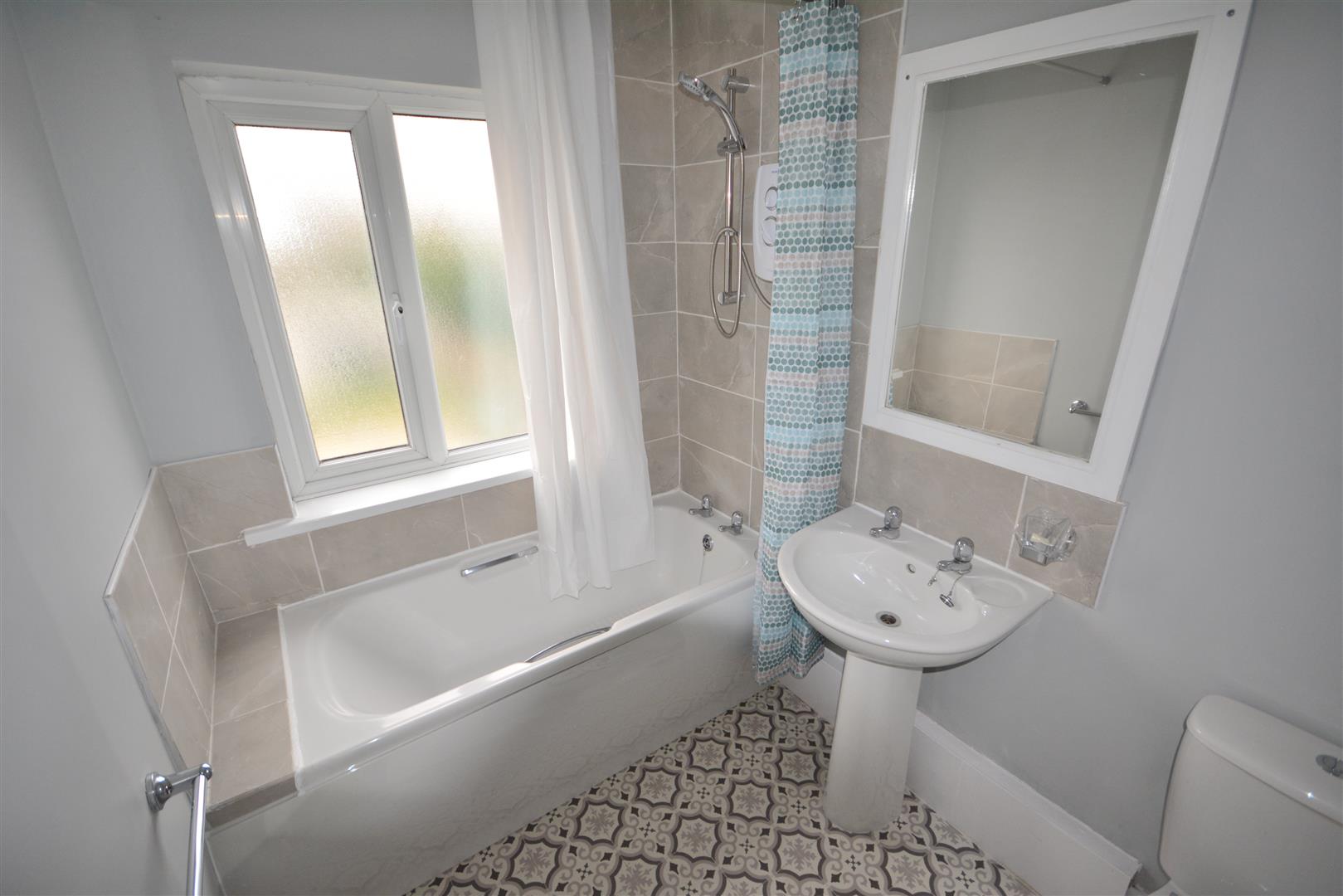 Having full suite in white comprising panelled bath with attractive ceramic wall tiles and electric fitted shower over. Pedestal wash hand basin and low-level WC. Extractor fan, central heating radiator and obscure double glazed window in UPVC to the rear.