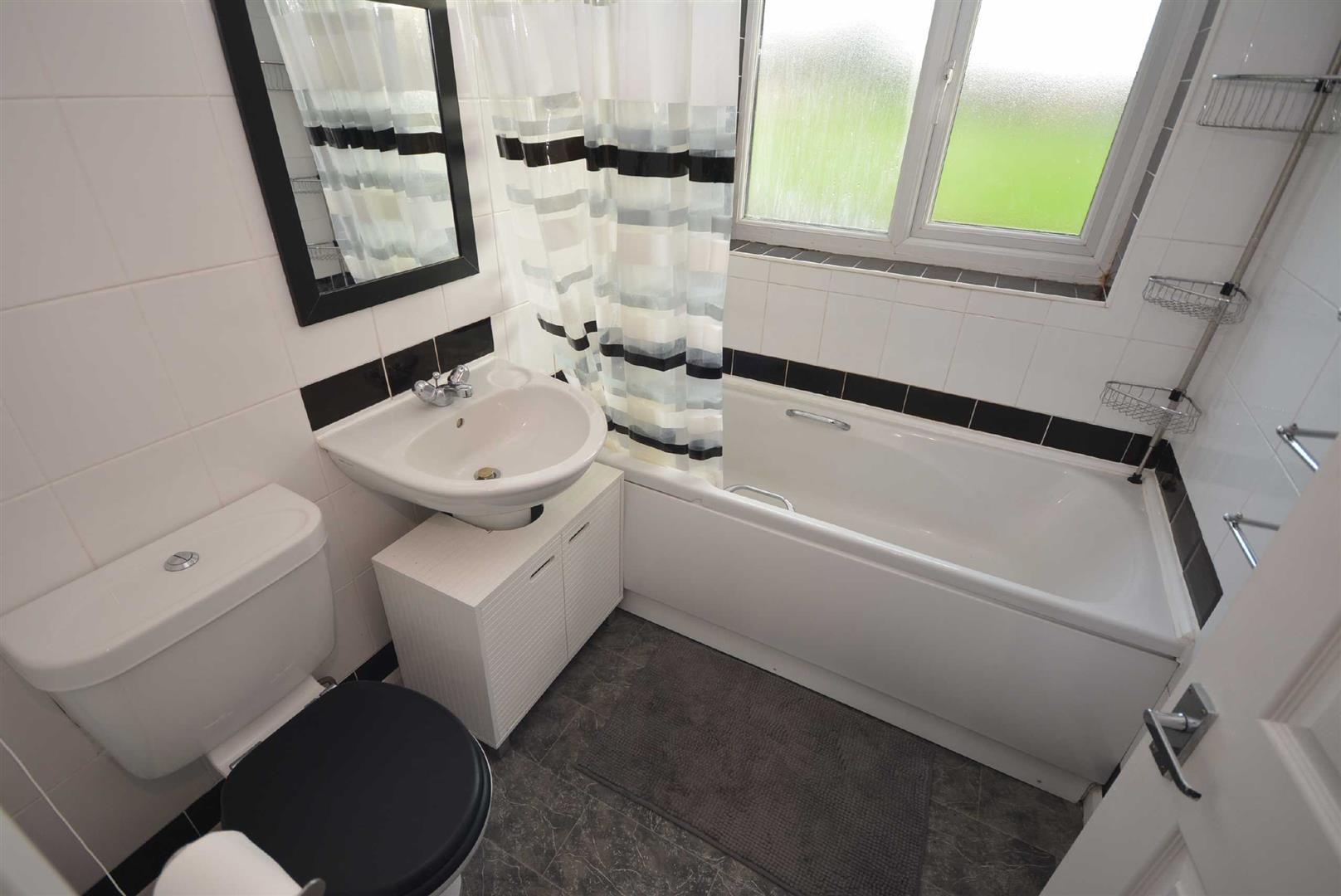 With full white suite comprising low level wc, pedestal wash hand basin, panelled bath with mixer tap and electric shower over, floor to ceiling ceramic wall tiling, slate tile effect flooring, central heating radiator, extractor fan and UPVC double glazed window to the rear.