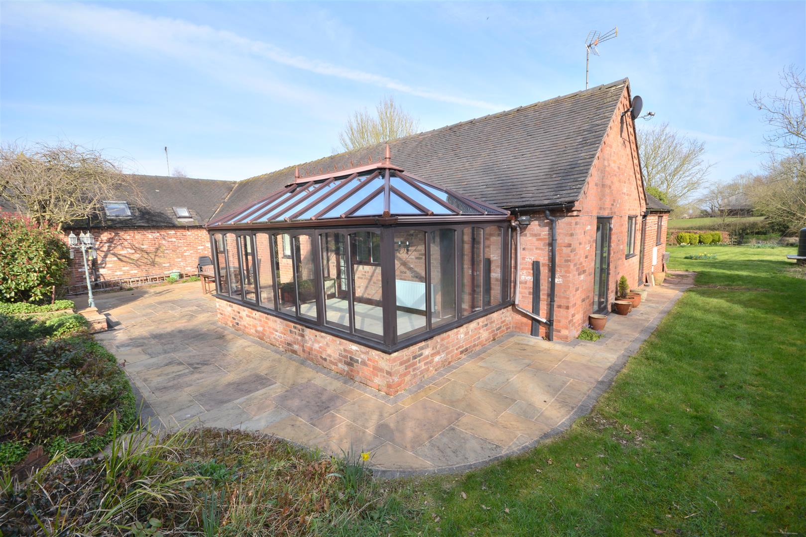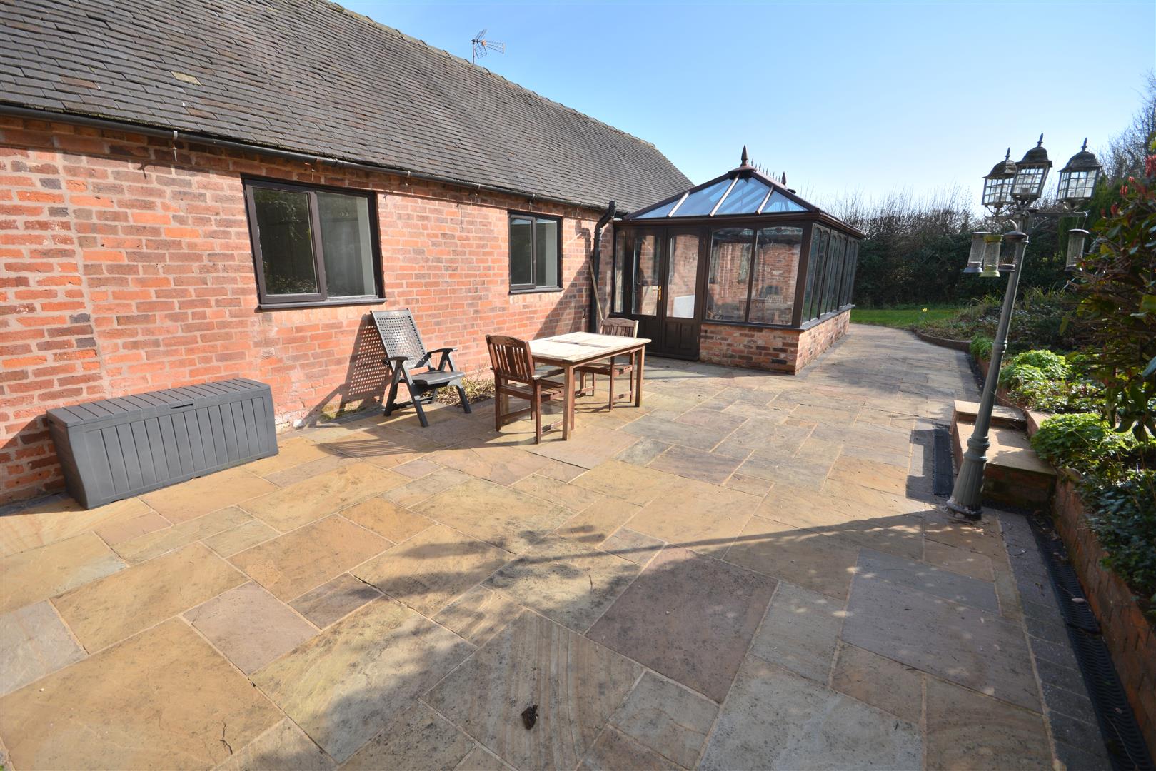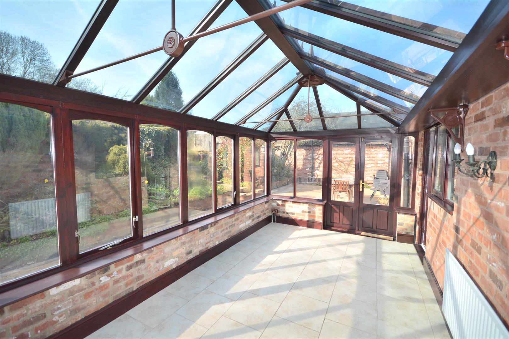 Fully glazed with a tiled floor and dual access from both the kitchen and dining room, the conservatory opens out to the patio area.