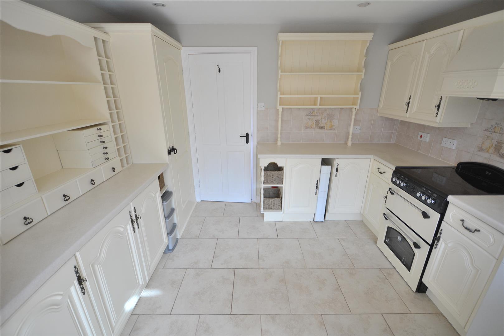 Well-appointed with a range of base and wall units, complementary worktops, and a central freestanding unit with shelving and workspace. The kitchen features tiled flooring, part-tiled walls, a sink and drainer with mixer tap, plumbing for a dishwasher and washing machine. A connecting door leads directly to the conservatory.