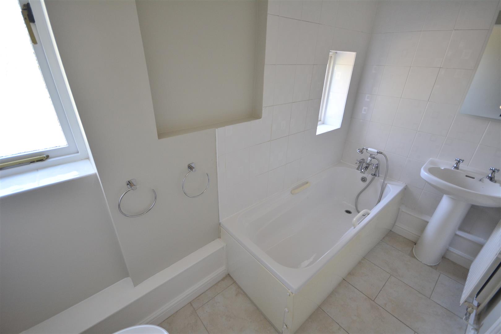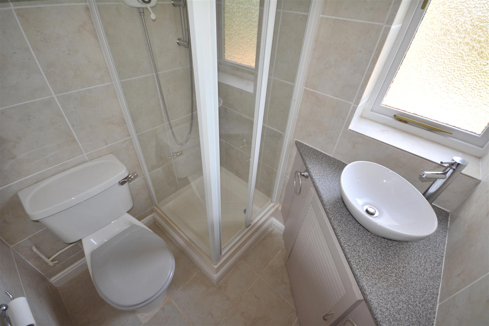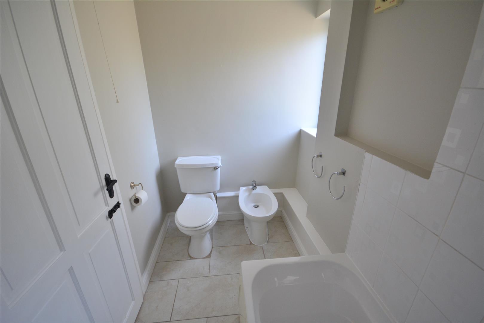 Comprising a panelled bath with shower over, pedestal wash basin, low-level W.C., bidet, and a window to the front.