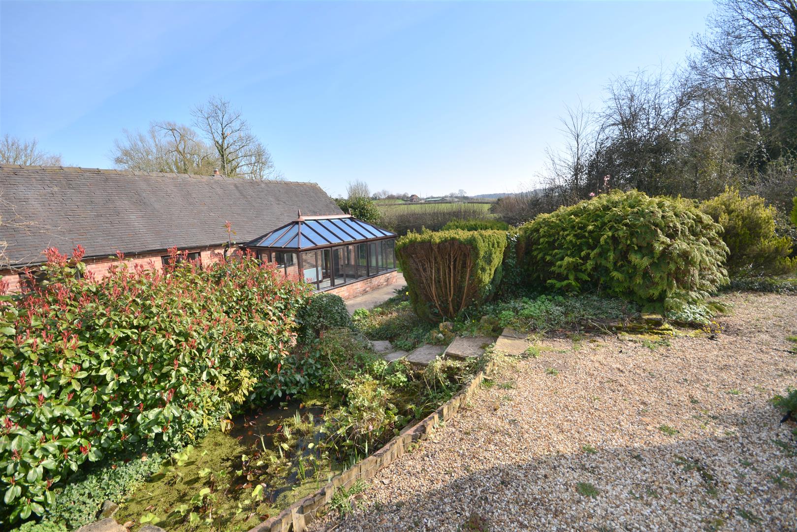 To the rear, the garden includes a pond, paved patio area, vegetable beds, flower borders, and steps leading to a raised seating spot. The lawn wraps around to the front of the property. The rear garden enjoys open views across an orchard beyond the rear boundary.