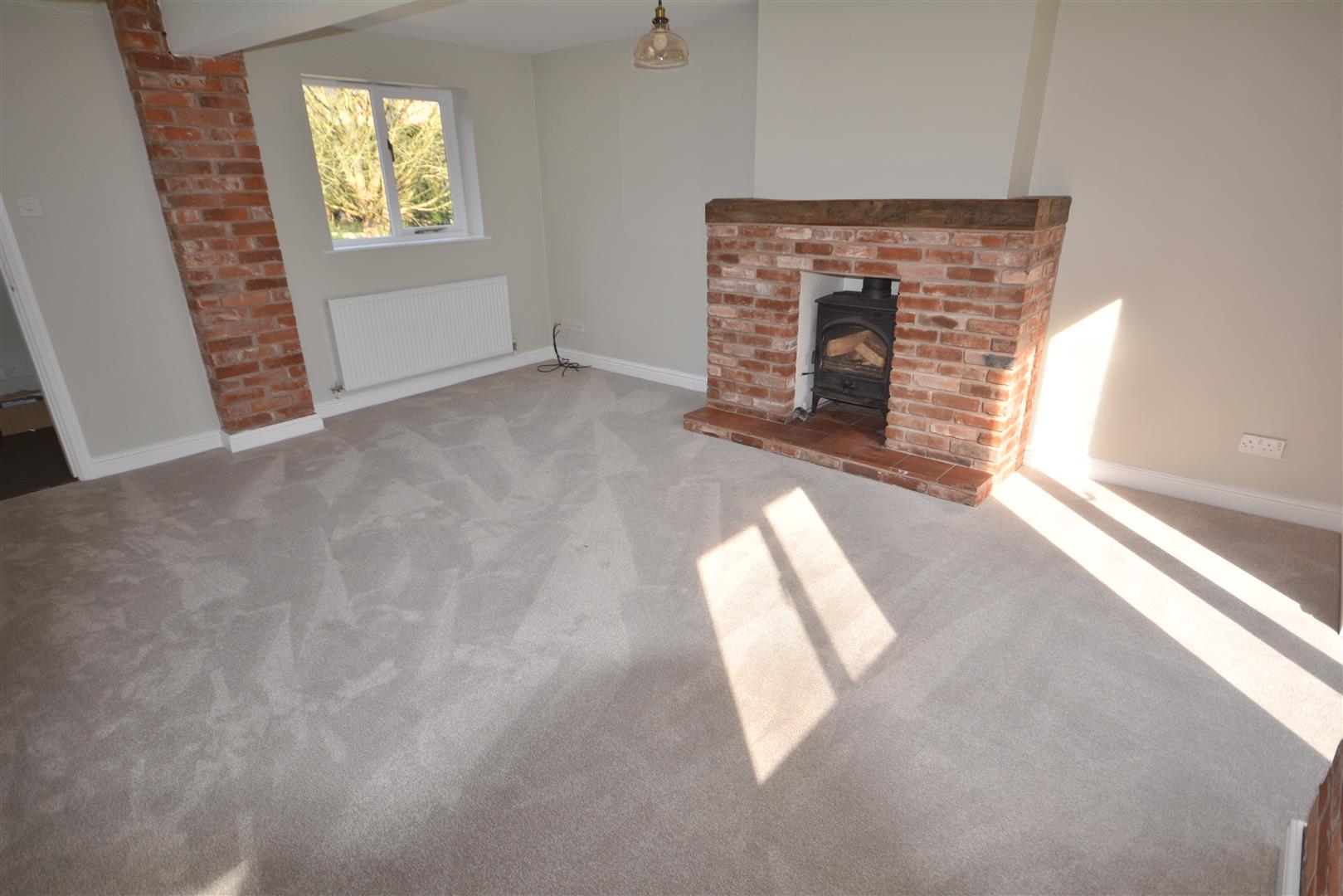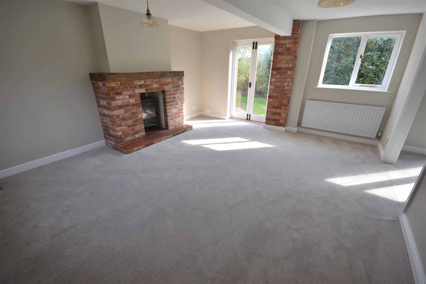 A spacious lounge room with an exposed brick fireplace housing a log burner on a tiled hearth. The room benefits from fresh decoration and new carpet. This inviting room also features a bare brick feature wall, French doors to the garden, windows to both the front and side, and an open archway to: