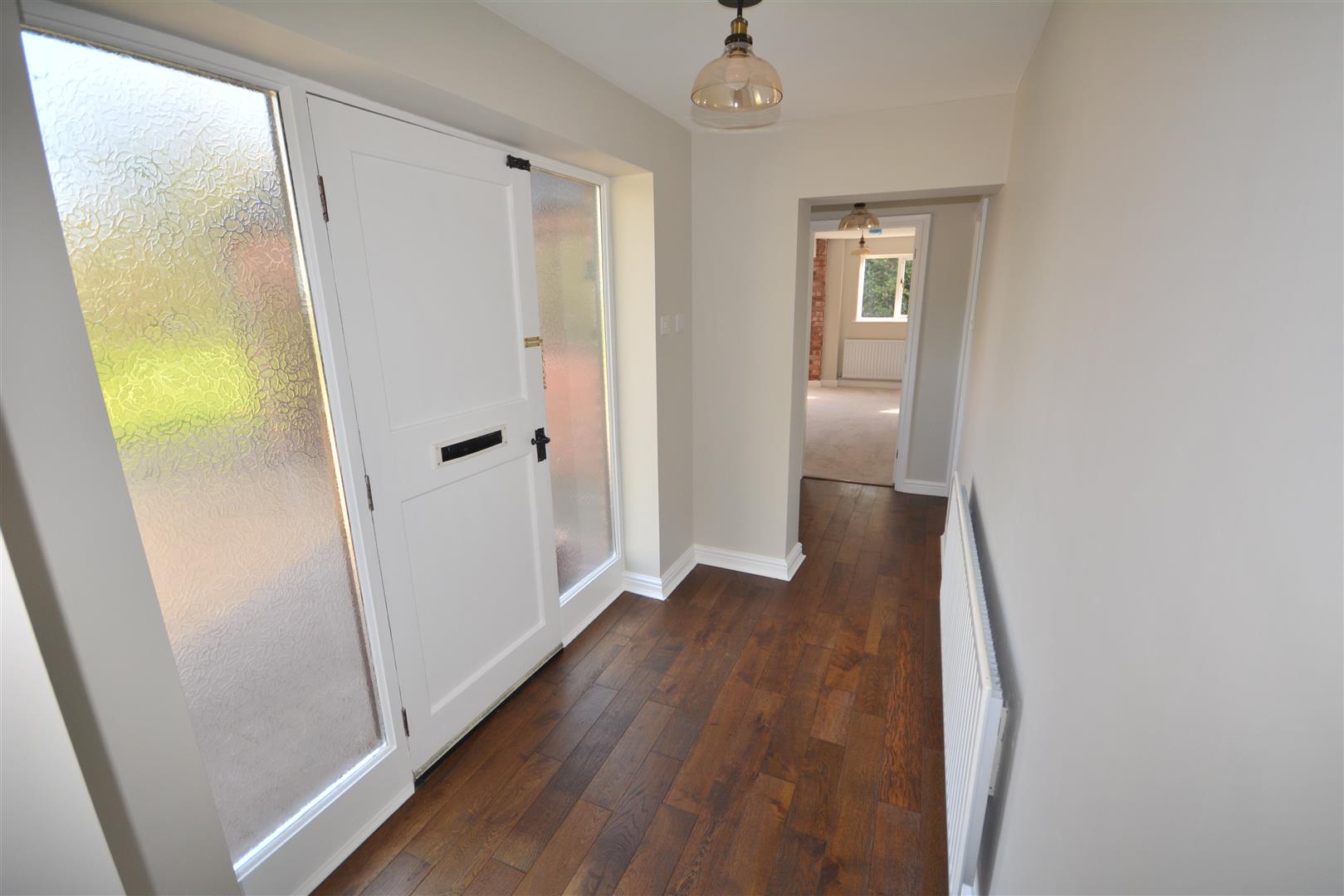 Accessed via a wooden front door framed by glazed side panels, the entrance porch opens into a welcoming hallway with exposed wood floorboards.