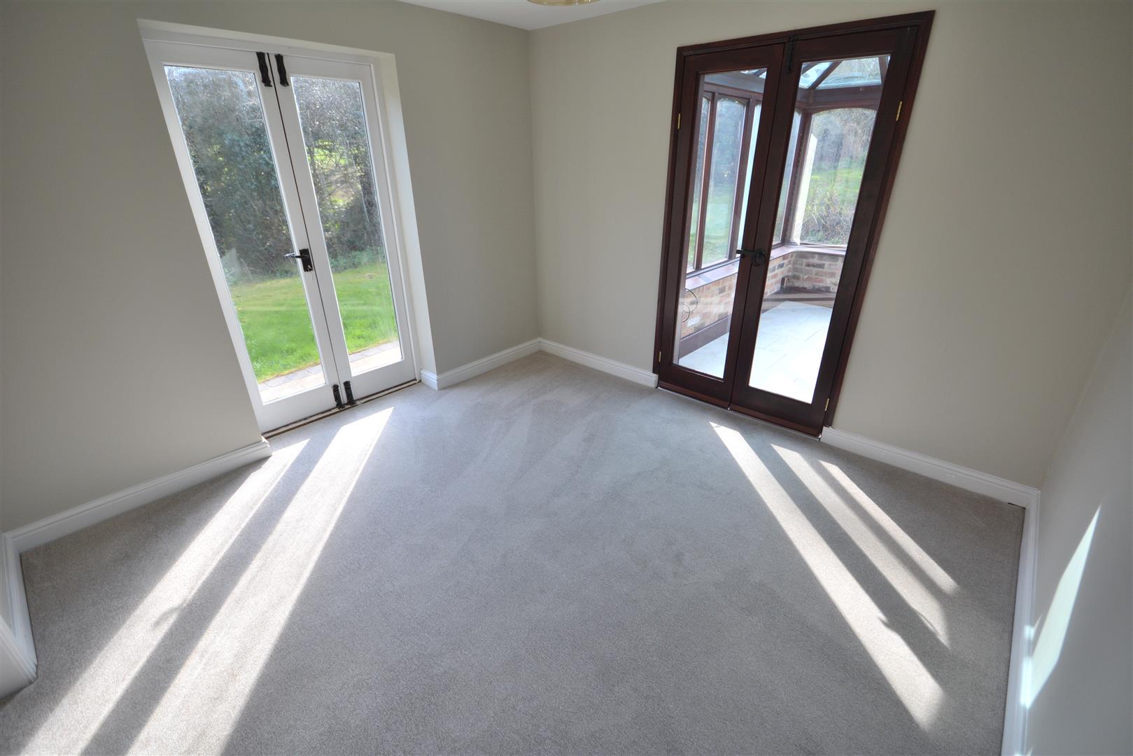 The dining room has French doors opening to the garden and internal double doors into the conservatory.