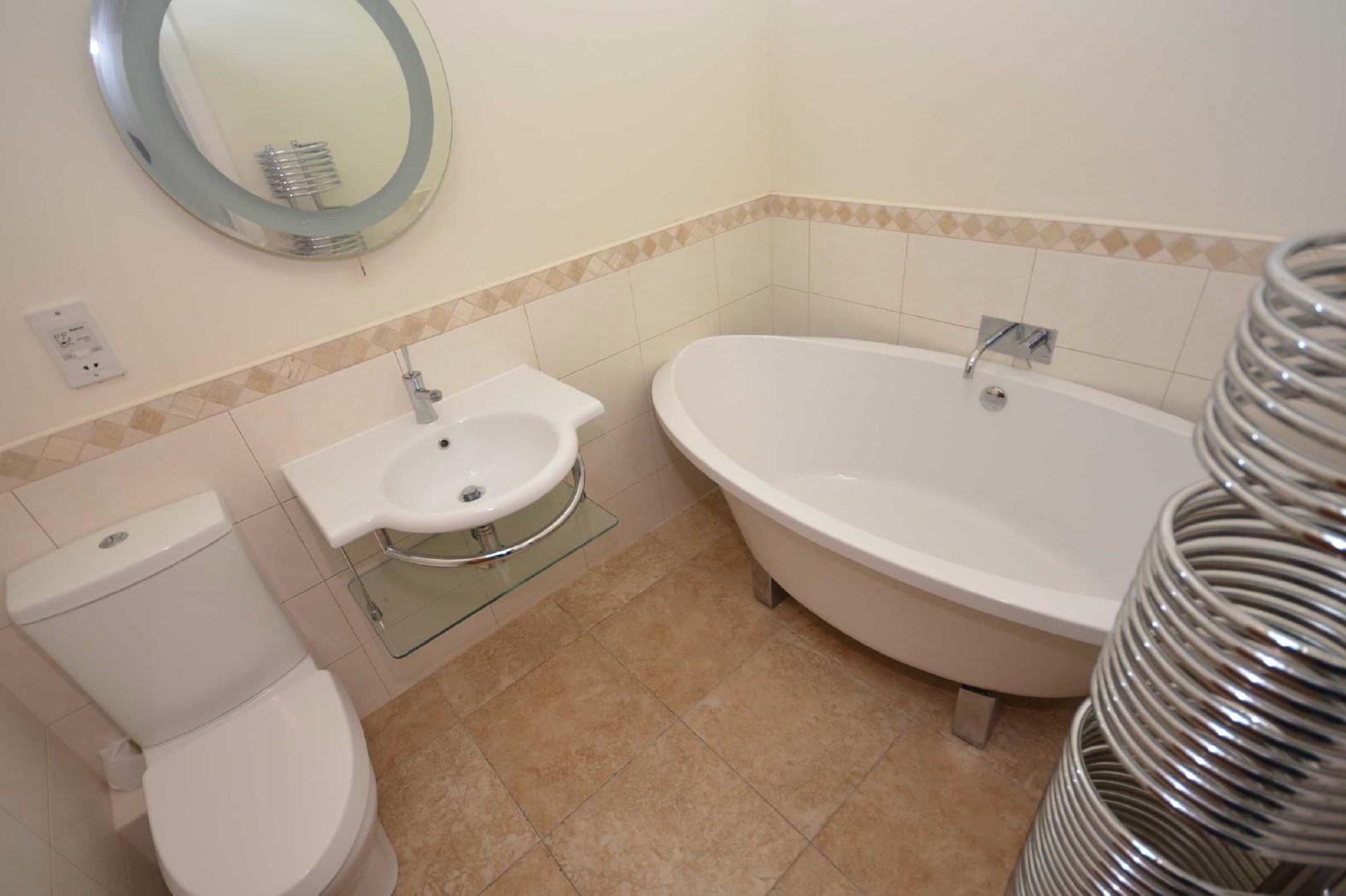 Which again must be seen to be appreciated having very stylish contemporary fittings, complemented by ceramic half wall tiling and ceramic tiled floor with under floor heating. Double-ended oval bath on four feet with headrest and mixer tap, wash basin with glass display shelf beneath together with a chromium-plated towel rail and mixer tap plus electric shaver point over and circular illuminated mirror over. Low suite w.c., adjustable lighting, illuminated truss and purlin, Velux double glazed roof light. Chromium-plated "spring-style" heated towel rail/radiator.