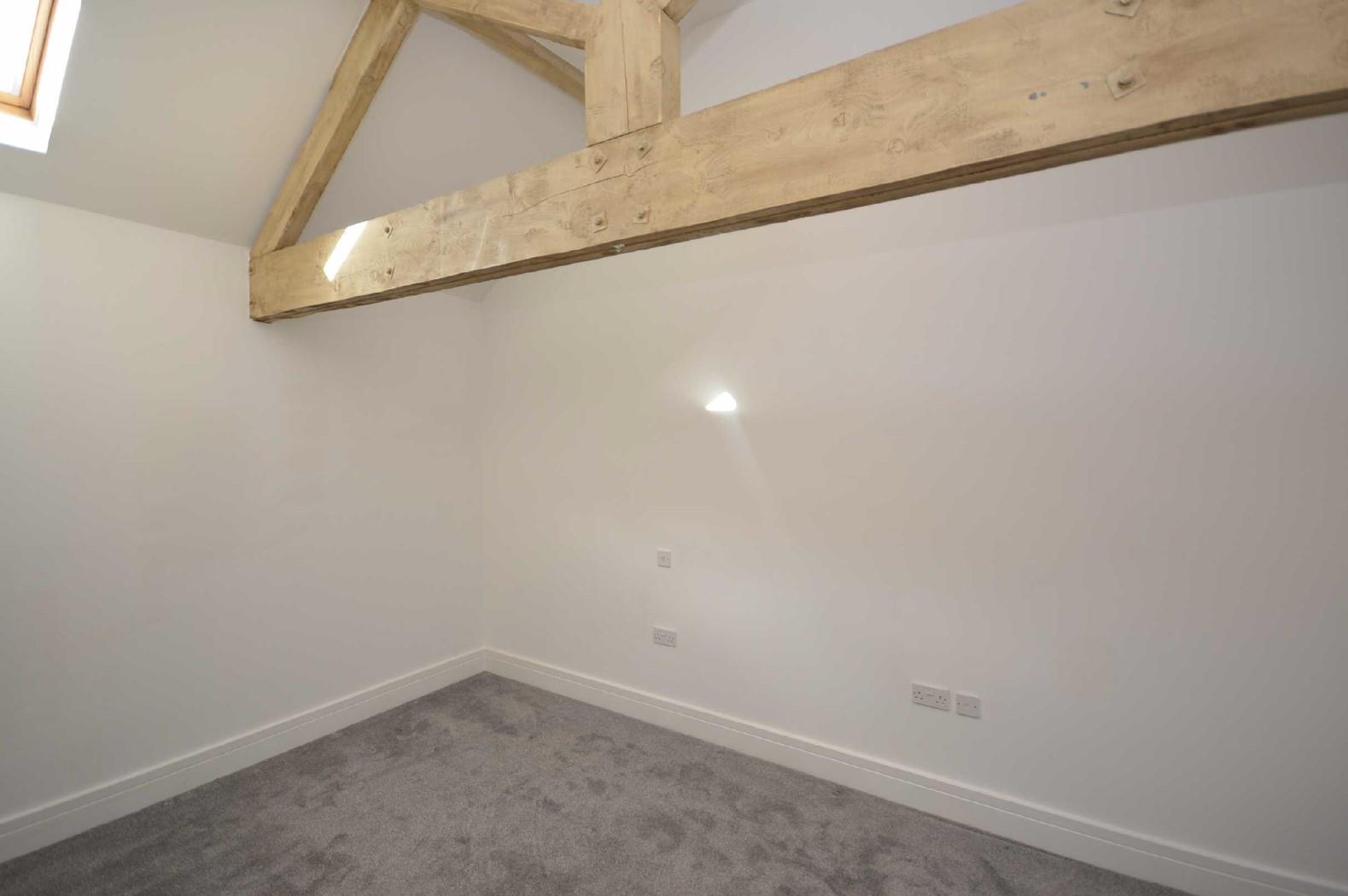 Fine exposed ceiling truss and purlins, central heating radiator, telephone jack point, TV aerial point, Velux double glazed roof light.
