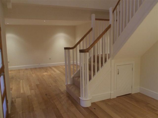 The measurements including the staircase with useful understairs storage cupboard. Matching polished oak flooring, telephone jack point, thermostat control for the central heating, further oak-framed glazed door to:
