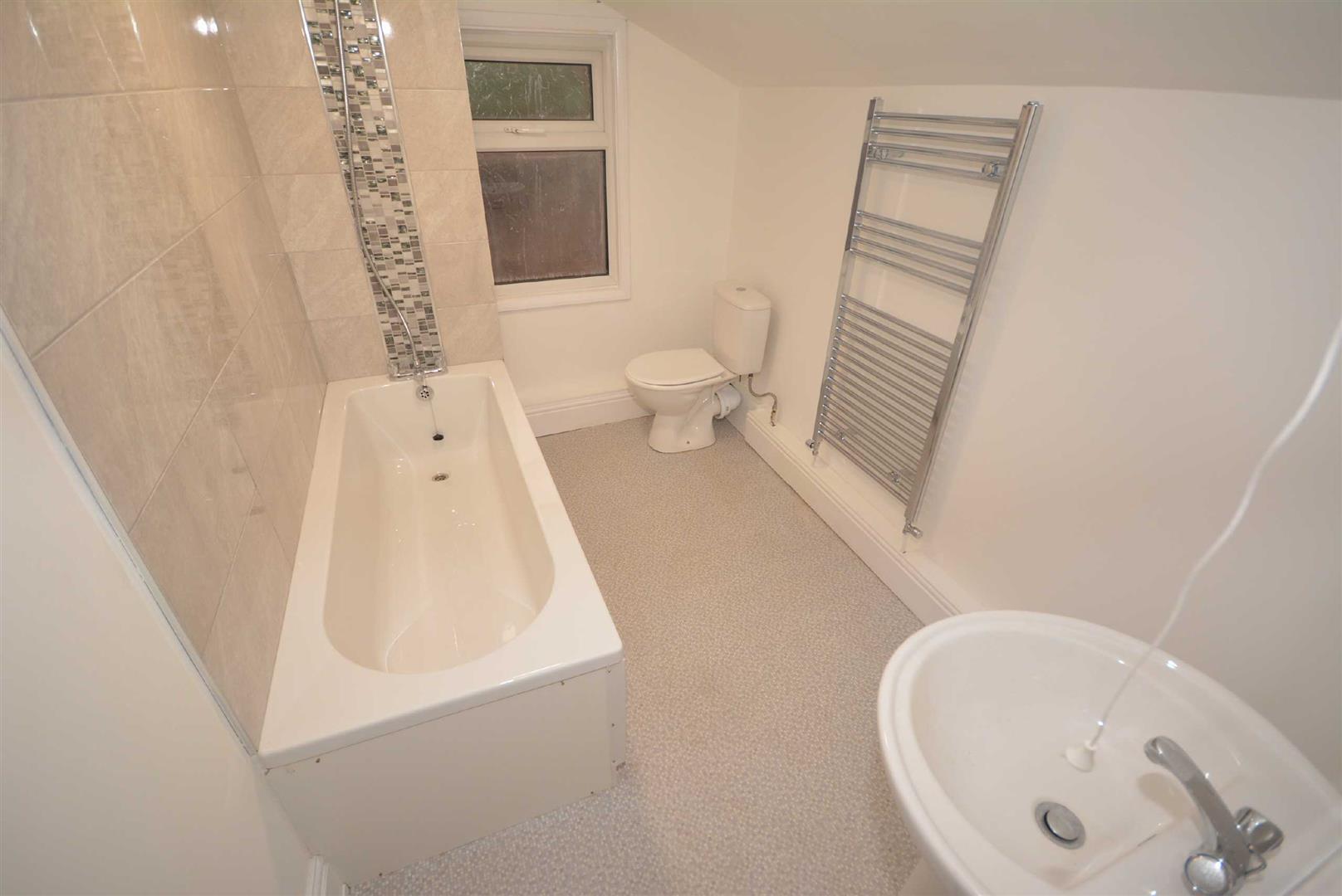With full suite in white comprising pedestal wash hand basin with chromed mixer tap, panelled bath with mixer tap and shower attachment and low flush WC. Complementary ceramic wall tiling. Vinyl flooring. Ladder style chromed centrally heated towel rail. Obscure UPVC double glazed window to the rear.
