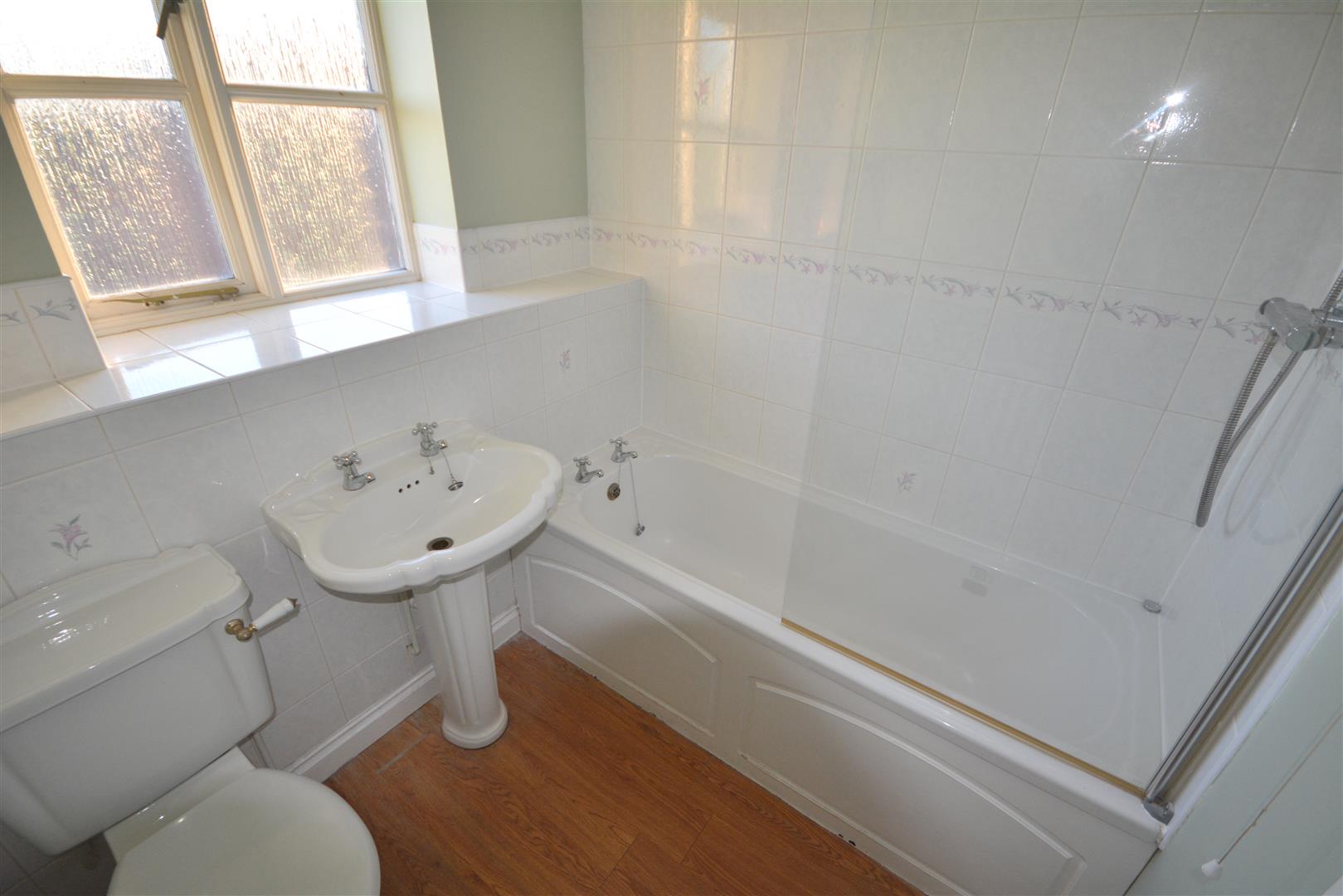 Being part tiled with a white suite comprising low flush WC, pedestal wash hand basin, panelled bath with shower over, central heating radiator, extractor fan, sealed unit double glazed window to rear.