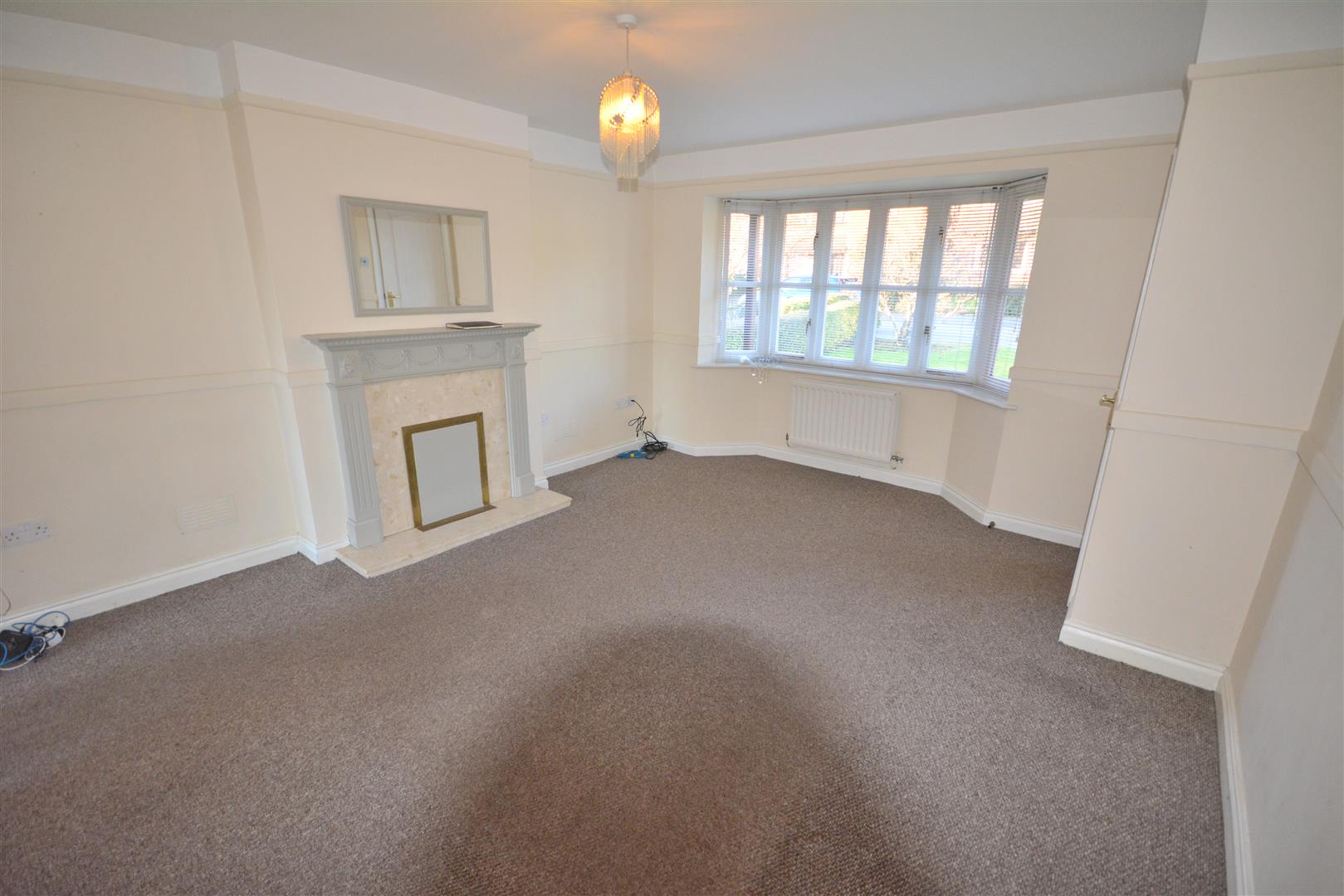 With feature fireplace, sealed unit double glazed bay window to front, central heating radiator, TV and telephone points, decorative coving, picture rail, multi paned door to: