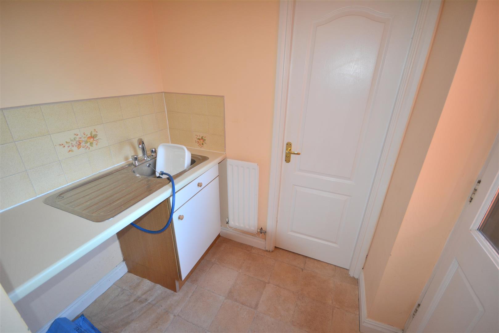 With a granite effect worktop having inset sink unit with tiled surround, fitted cupboard beneath and appliance space, central heating radiator, panelled and sealed unit double glazed door to rear, further panelled door to: