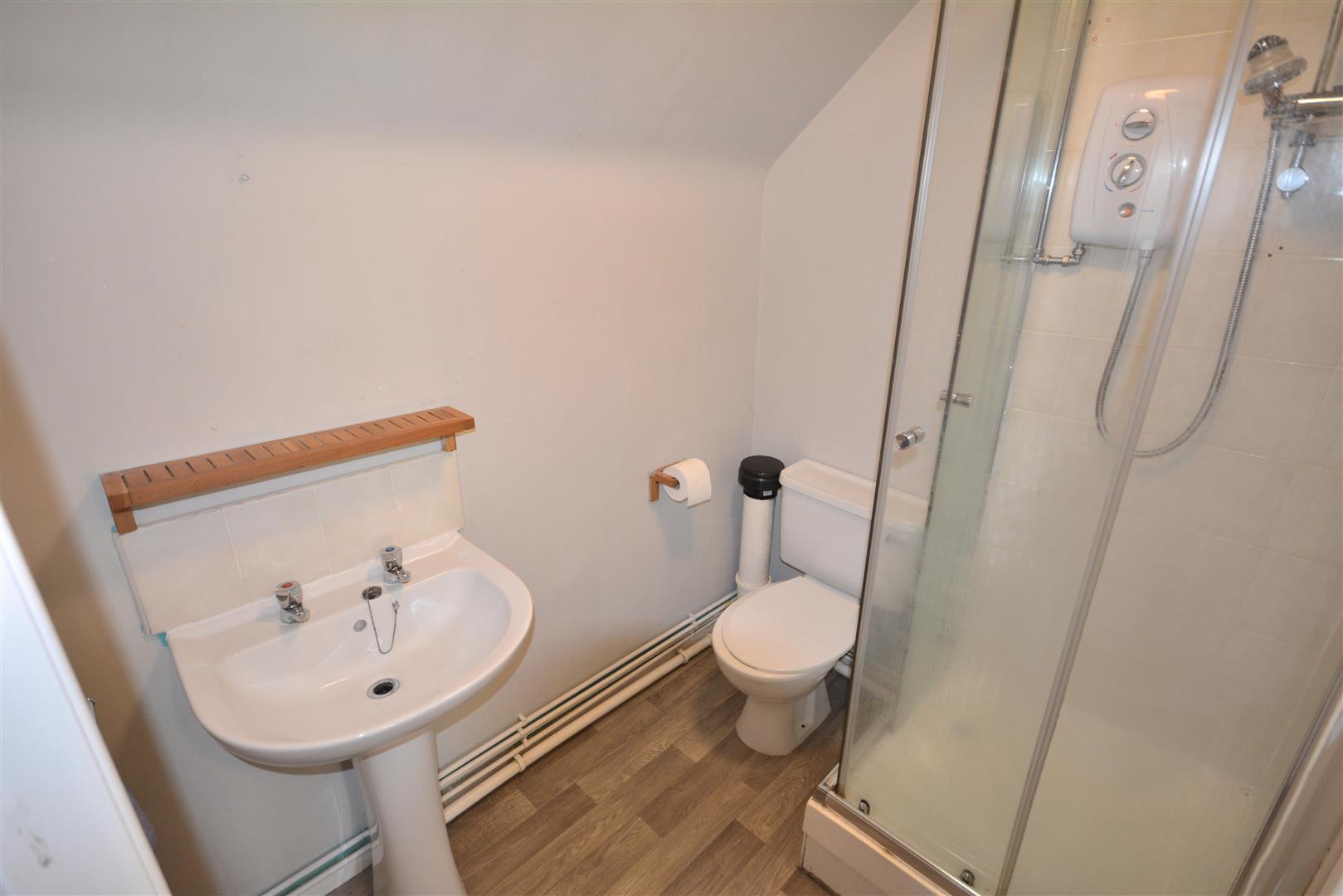 With full suite in white to include pedestal wash hand basin, low flush wc and shower tray with electric shower over. Ceramic wall tiling. Radiator and wood grain effect lino floor covering, extractor fan.
