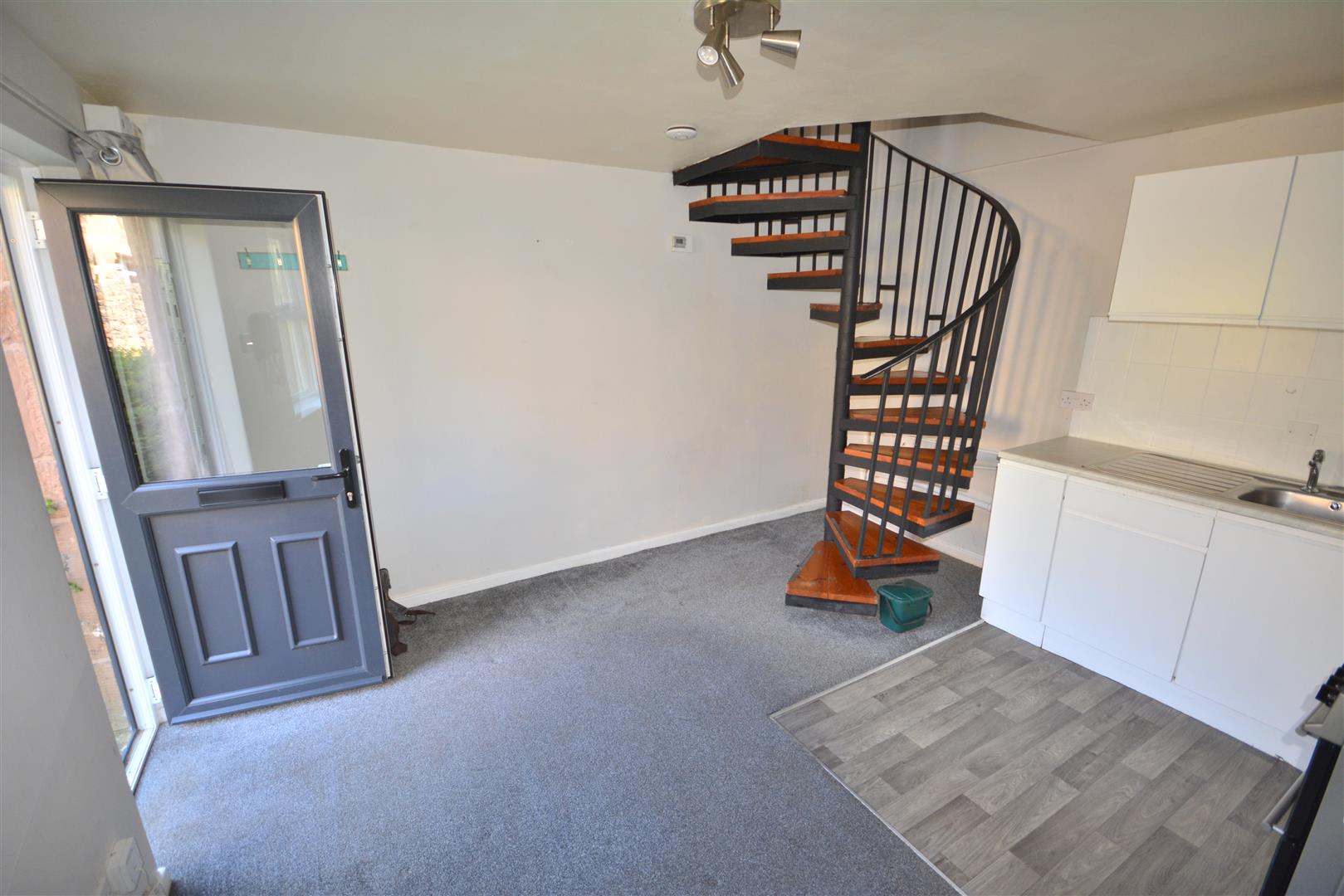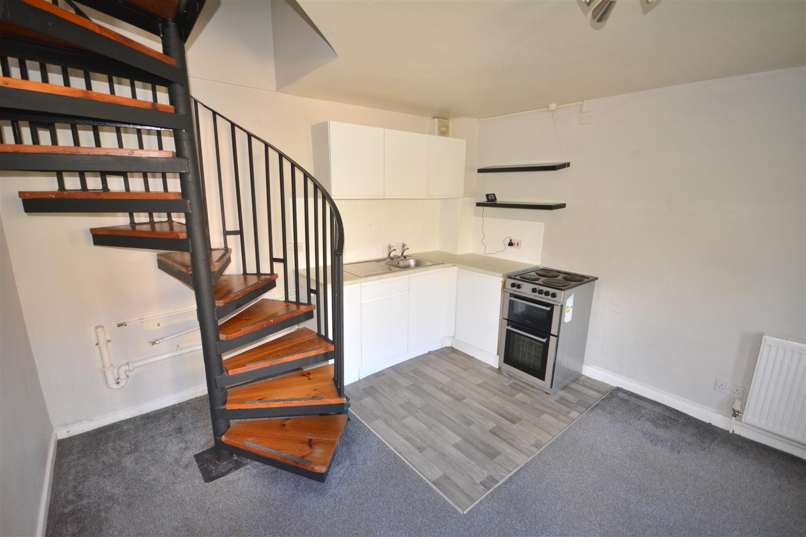 With ample seating area, central heating radiator, boiler servicing the hot water and central heating, sealed unit double glazed sash style window to the front, glazed and panelled door. Kitchen area comprising a range of matching base, wall and drawer units, fitted laminated roll edge preparation surfaces with inset stainless steel sink unit draining board, four ring electric oven and plumbing suitable for an automatic washing machine, spiral staircase leads to:-